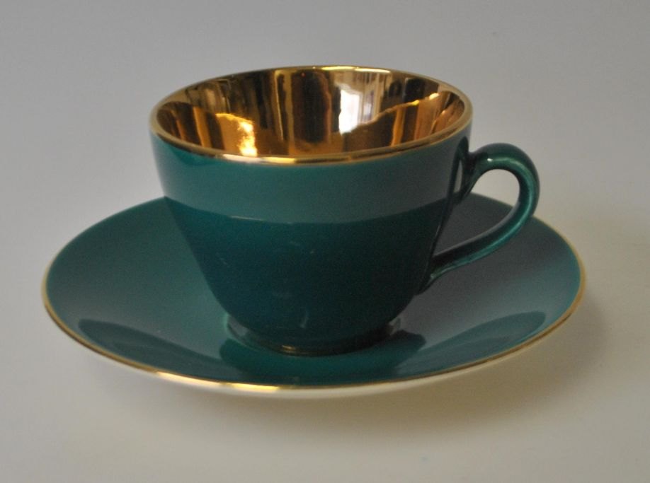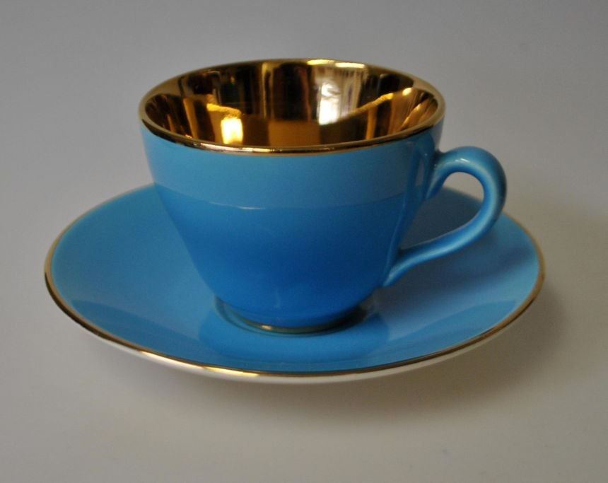 Mocca cups with saucers, 6 G, Confetti, Aluminia, Royal Copenhagen, Copenhagen, Denmark. Faience. With internal gilding. Stamped: Confetti, Copenhagen, Denmark 6 GH: 5.5 cm. Dia. saucer: 12 cm.