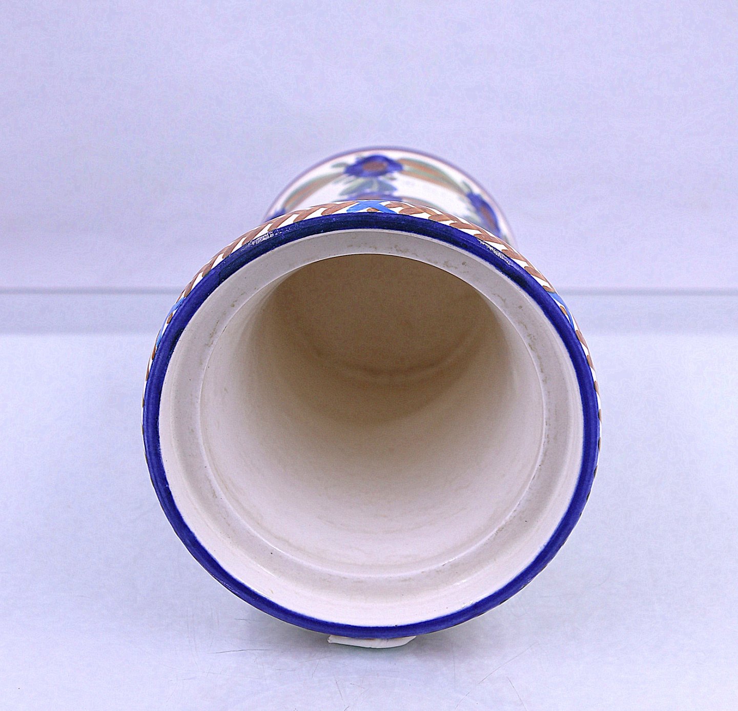 Aluminia, vase nr. 523/399. kunstfajance vase dekoreret med blå blomster og grønne/brune blade, på cremefarvet baggrund. Glasuren er polykrom