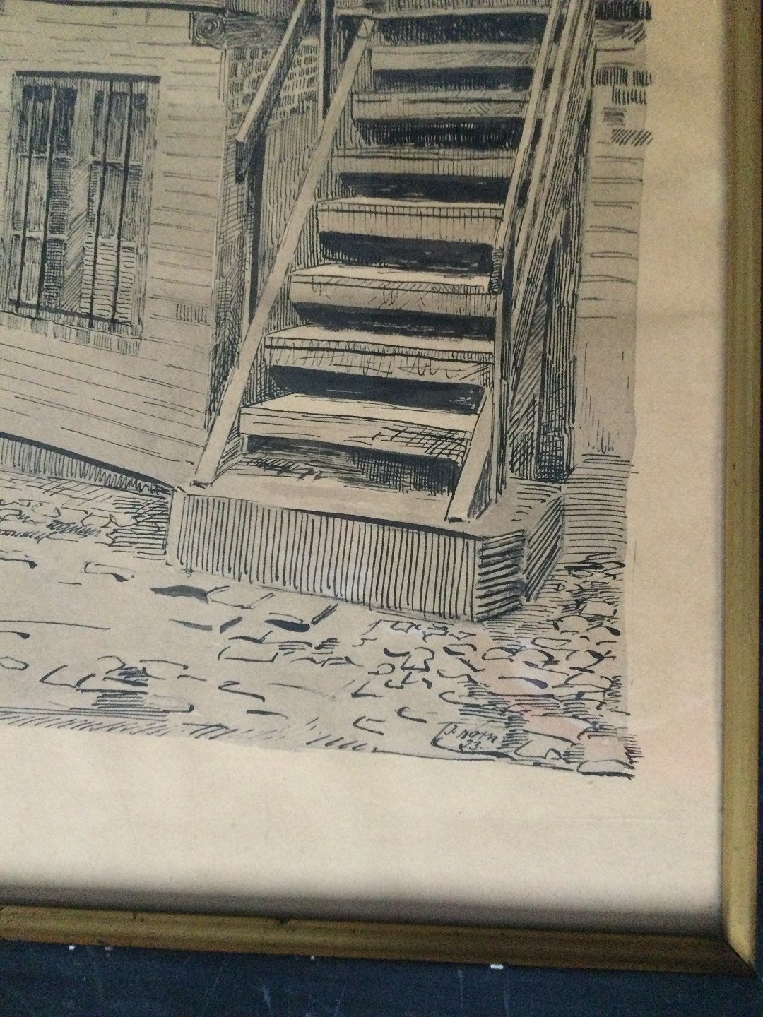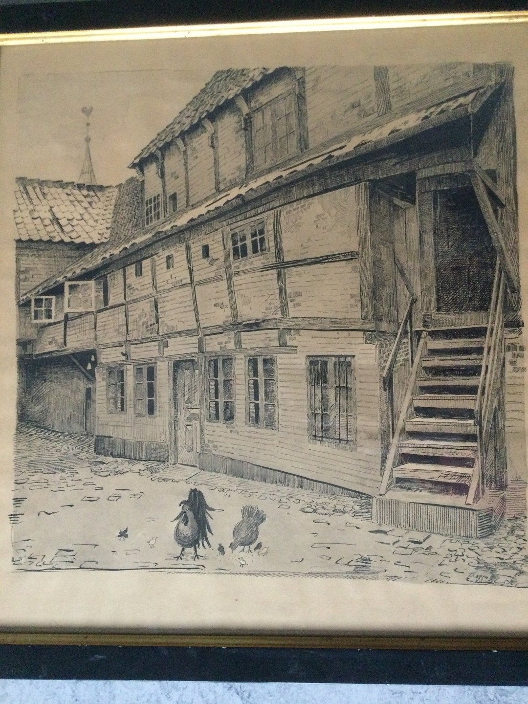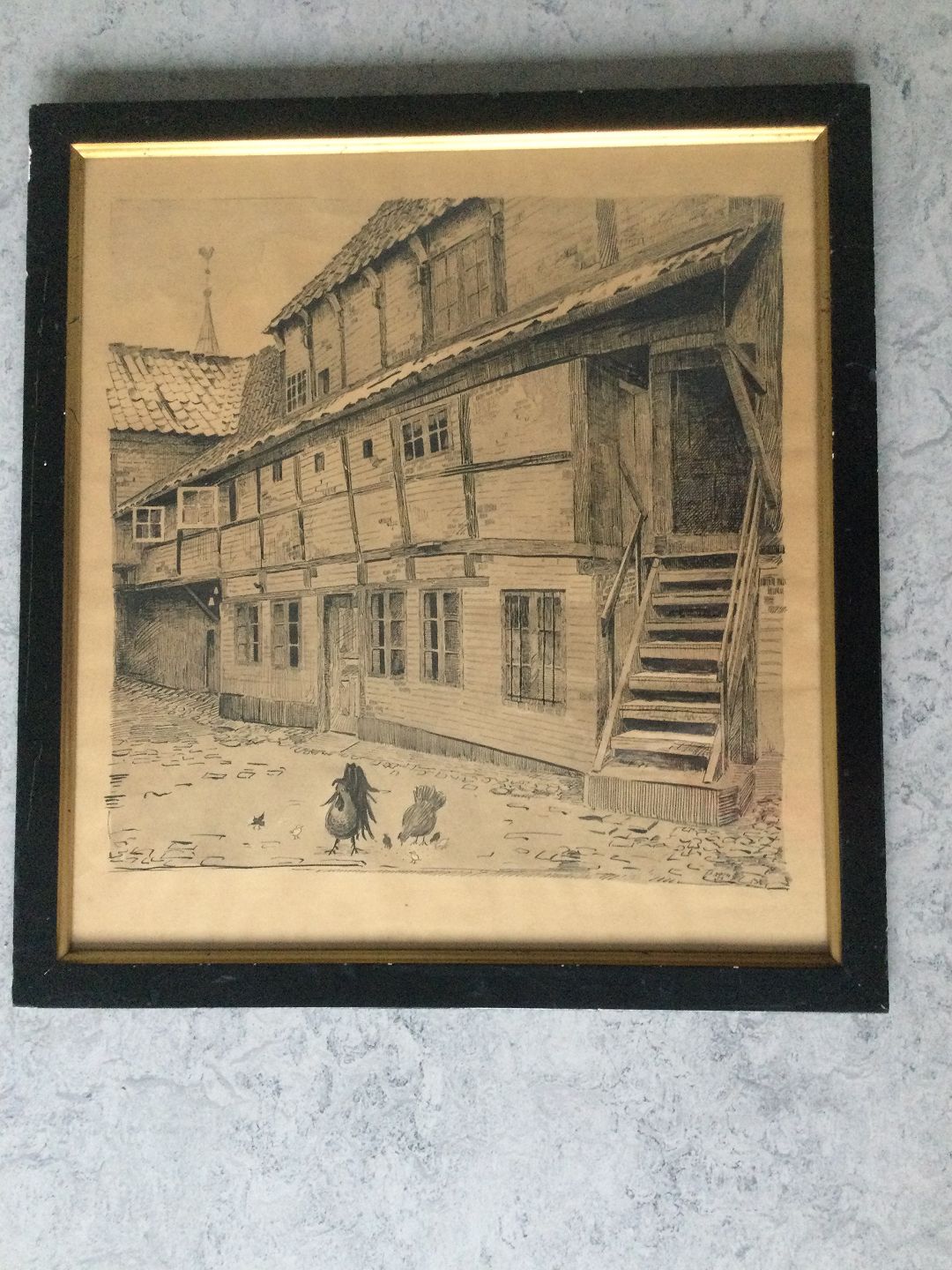 Tegning af Viggo J. Norn - Baggården til Brix' Gaard i Aalborg 1923.
