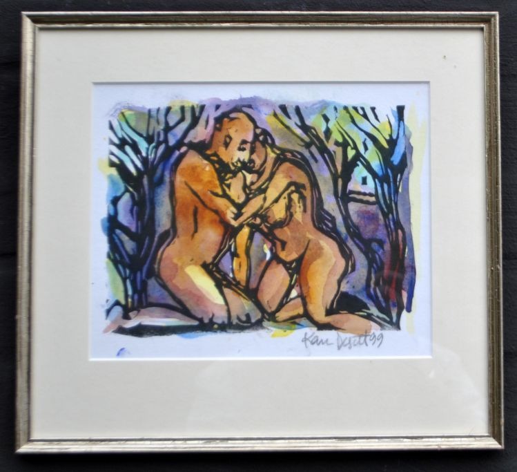 Degett, Karen (1954 - 2011) Danmark: Erotisk scene. Håndkoloreret linoleumstryk. Unika. Signeret. 20 x 24,5 cm.  Indrammet.
