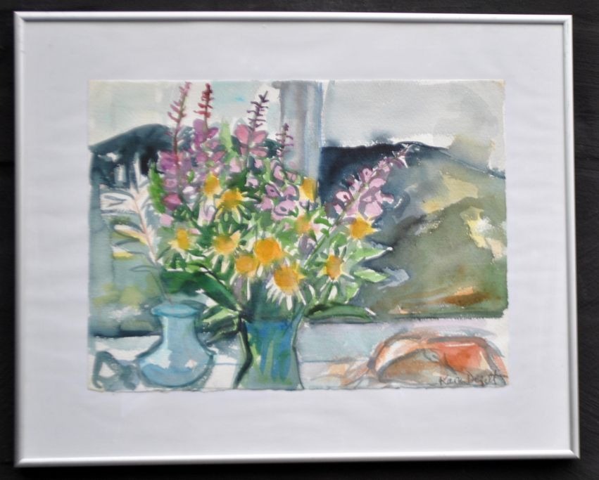 Degett, Karen (1954 - 2011) Danmark: En buket i vinduet. Akvarel. Signeret. 28 x 38 cm.  Indrammet. Proveniens: Kunstnerens bo.