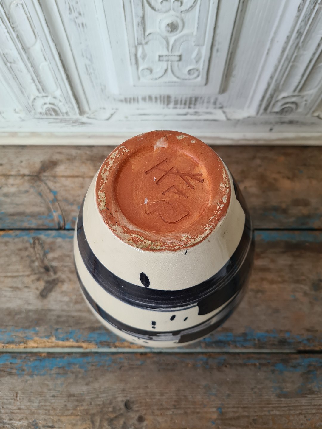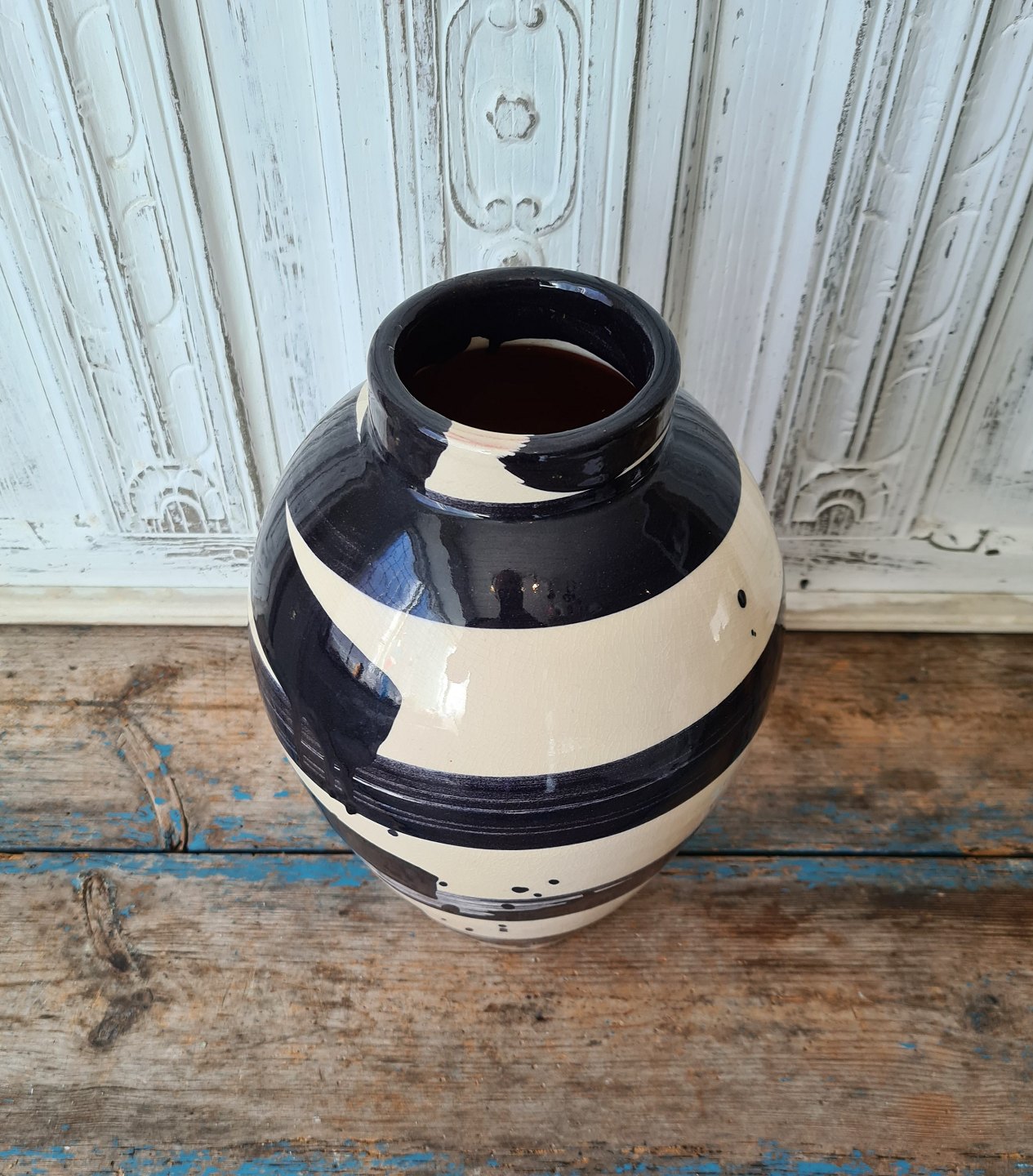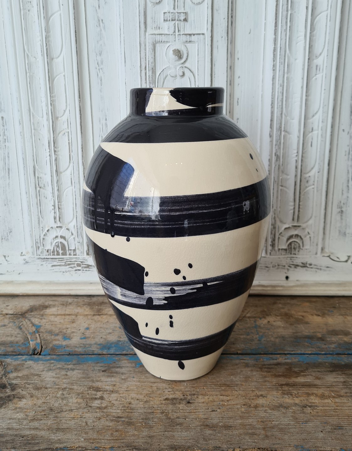 Cremefarvet vase dekoreret med abstrakte sorte penselstrøg.
