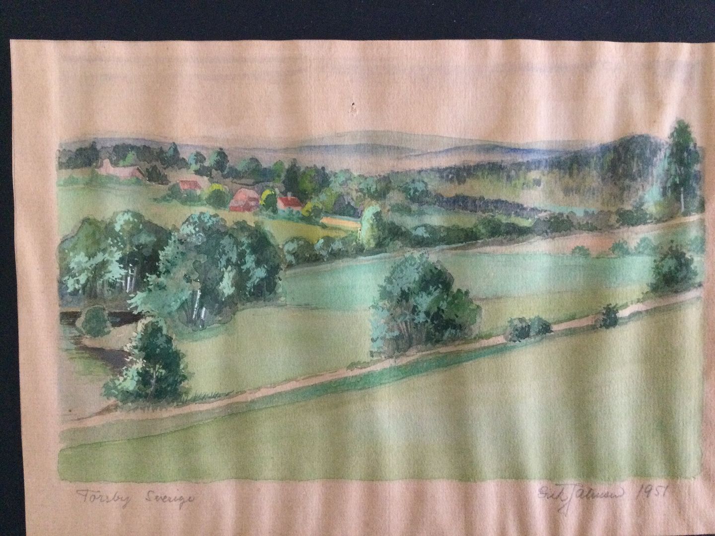 Akvarel af Erik Jahnsen - Landskab ved Torsby i Sverige 1951.