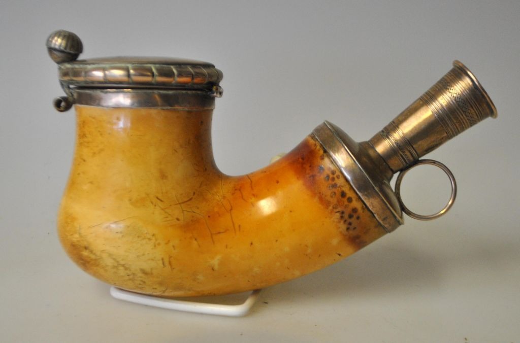 Stor blok erskum pibe hoved, 1871. Horsens. Danmark. Med utydelige mestermærker på låg og spids. Der er dog tale om en Horsens mester. L.: 18 cm. H.: 9,5 cm. På låb inskription: Erindring fra Horsens Sygekasse 1877.