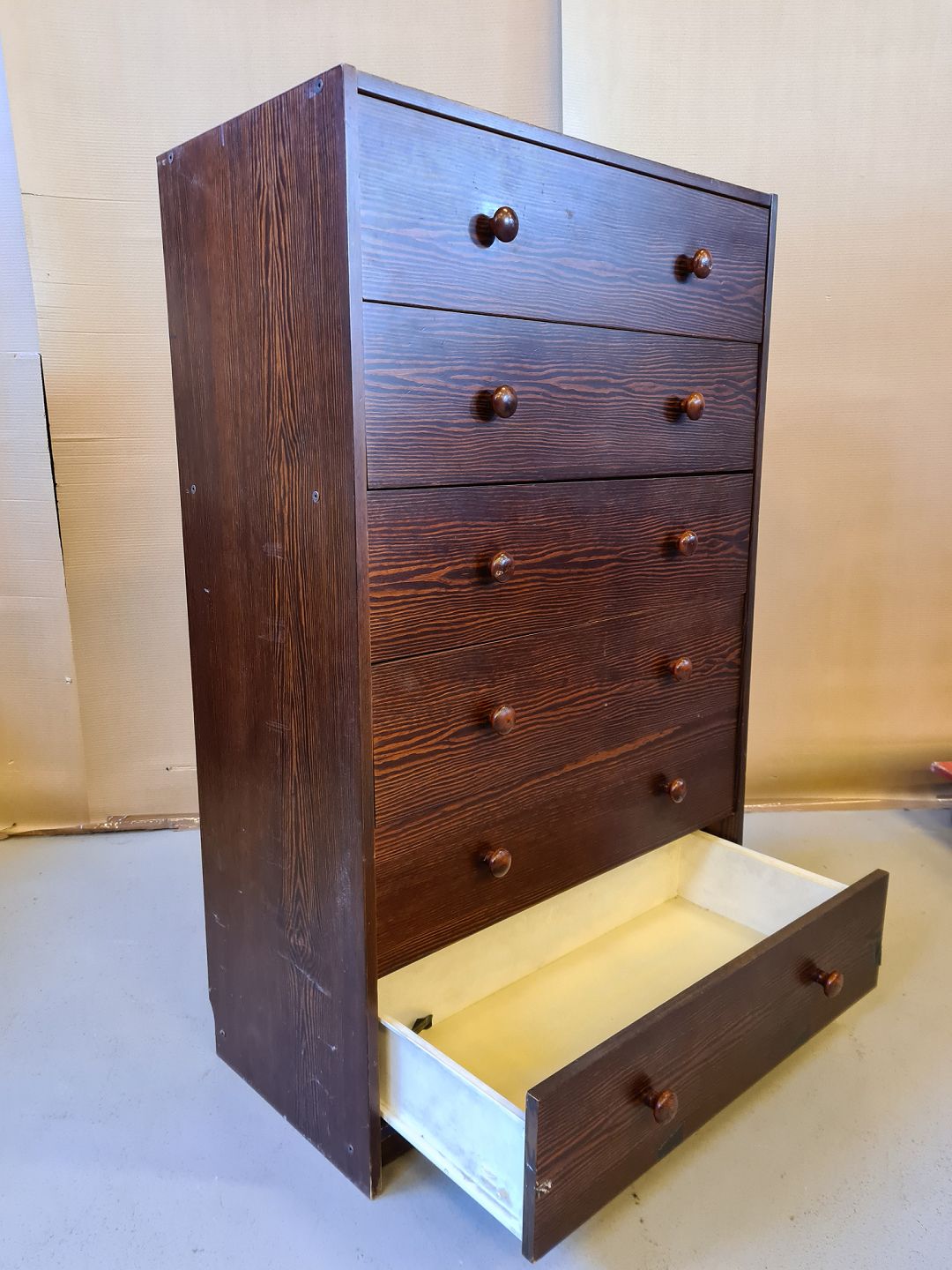Kommode i fineret og bejset fyrretræ fra 1980erne