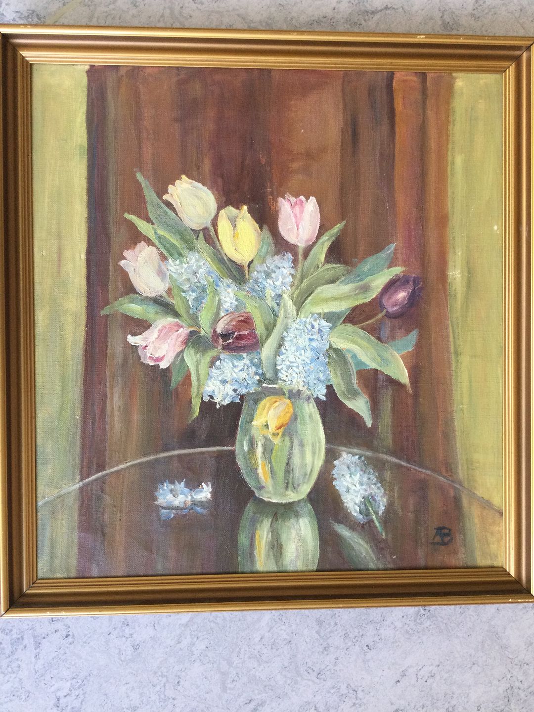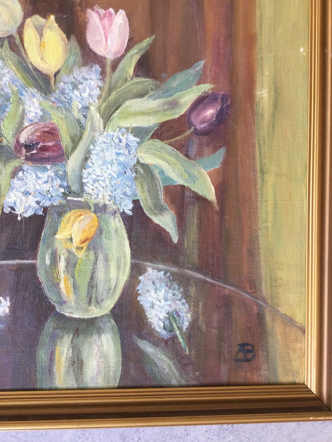 Maleri af Ane Brügger - Vase med tulipaner og hyacinter.