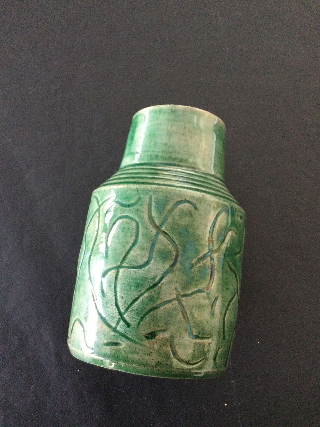 Vase med grøn glasur og streg dekoration.