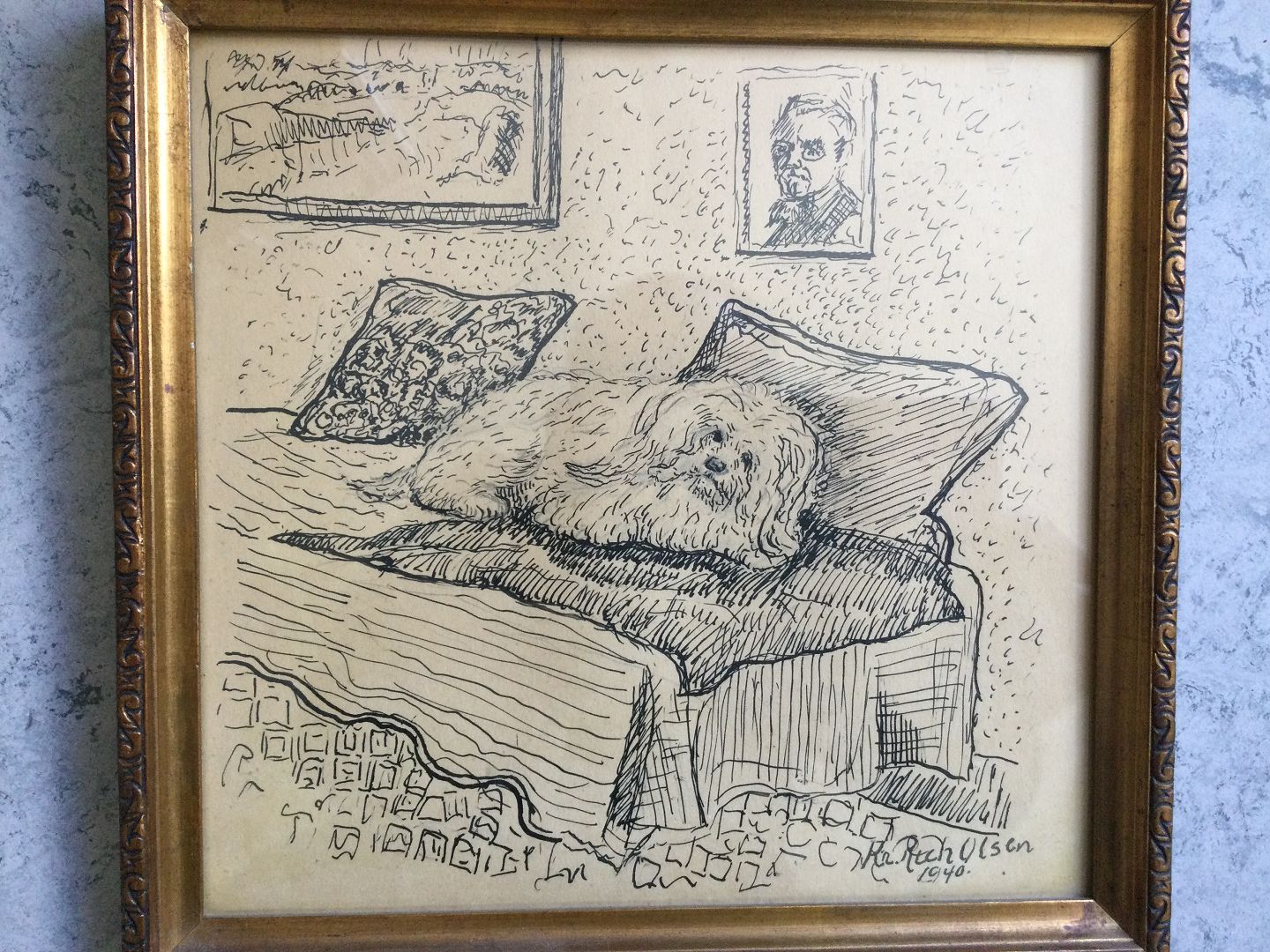 Tegning af Kristian Richard Olsen - Liggende hund på divan 1940.