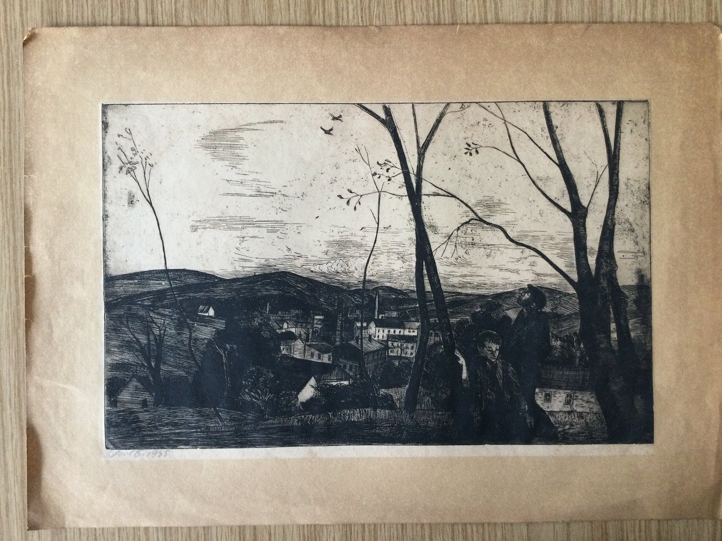 Radering af Povl Christensen 1935 - Udsigt ud over by.