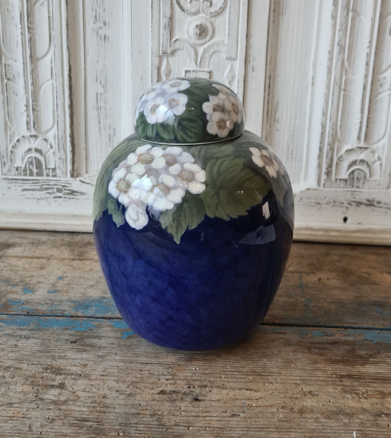 Royal Copenhagen Art Nouveau lågvase dekoreret med jordbærblomster, jordbær løv på blå bund. Bemalet af Else Hasselriis no. 2361/1242