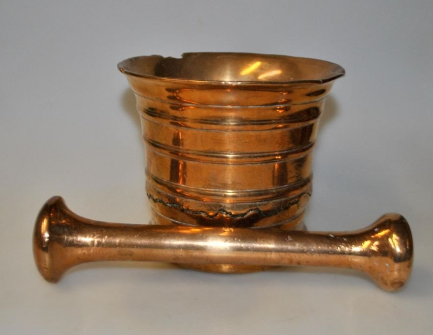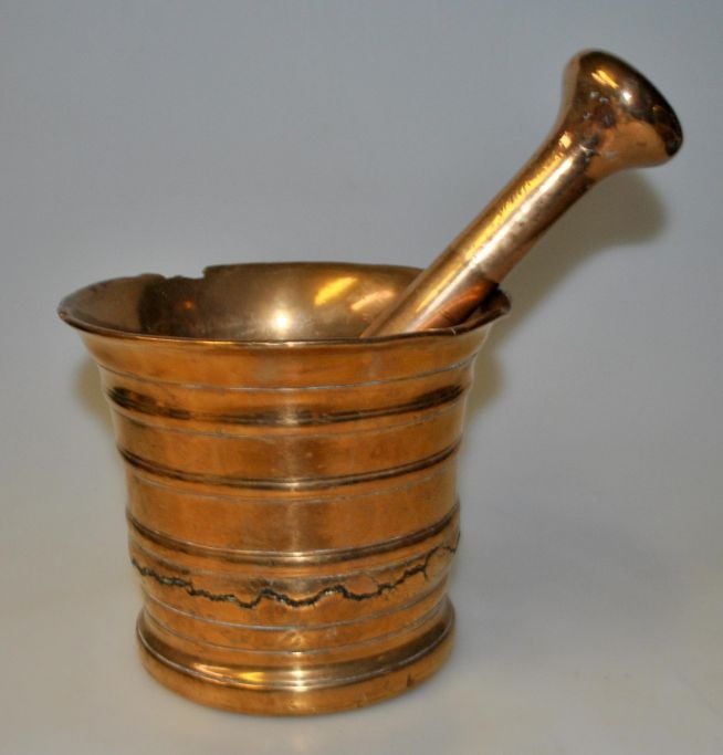 Apoteker messing morter fra Nibe Apotek med pistil, 18. årh. Danmark. Virkelig brugt eksemplar. H.,: 12 cm. Længde pistil: 21 cm.