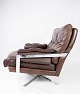 Denne lænestol i patineret brunt læder og stel i metal er et tidløst møbelstykke designet af den anerkendte svenske designer Arne Norell og fremstillet af Vatne Møbler i 1970'erne.