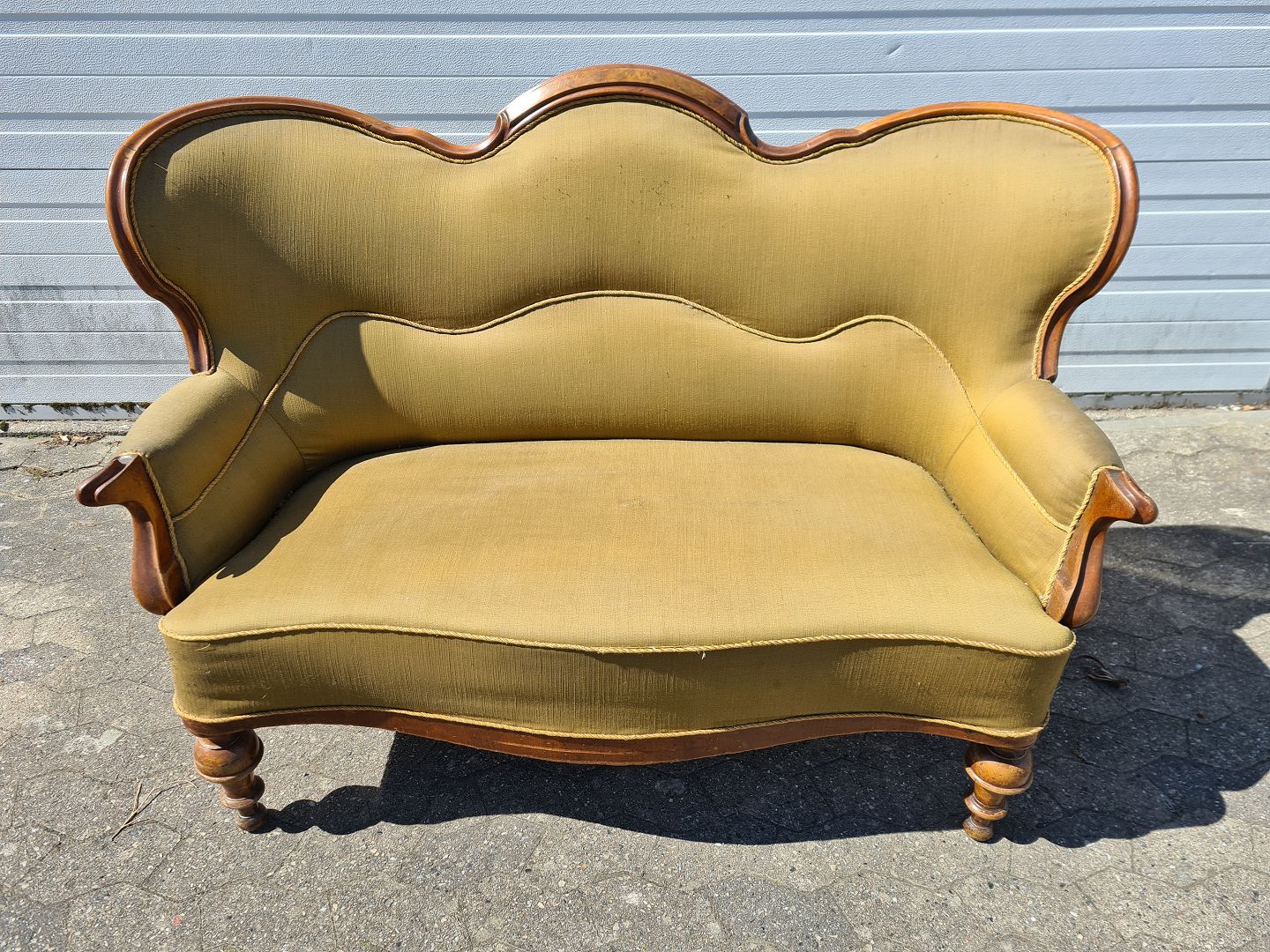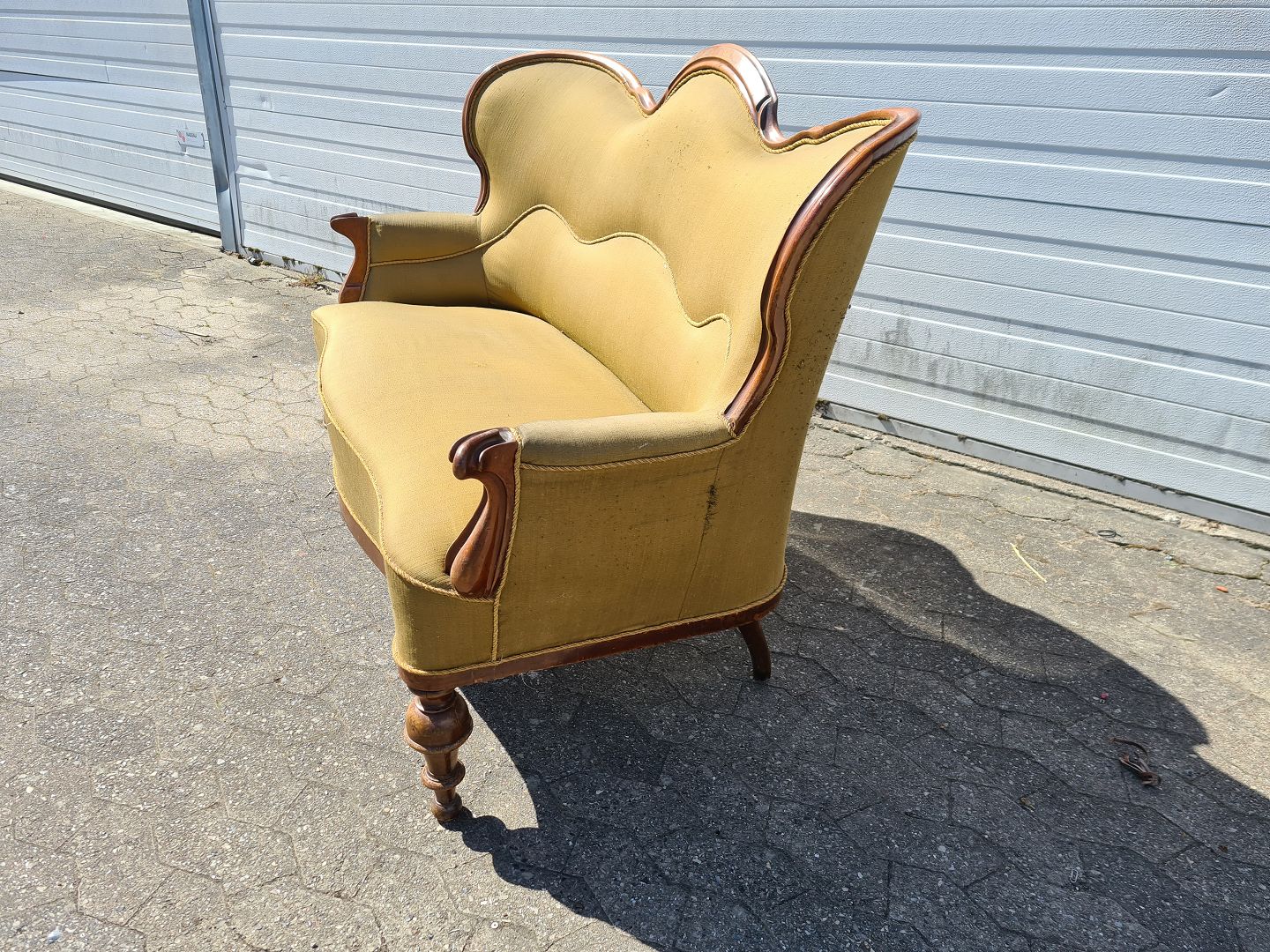 Salonsofa i mahogni fra 1890erne. Den har brugsspor.