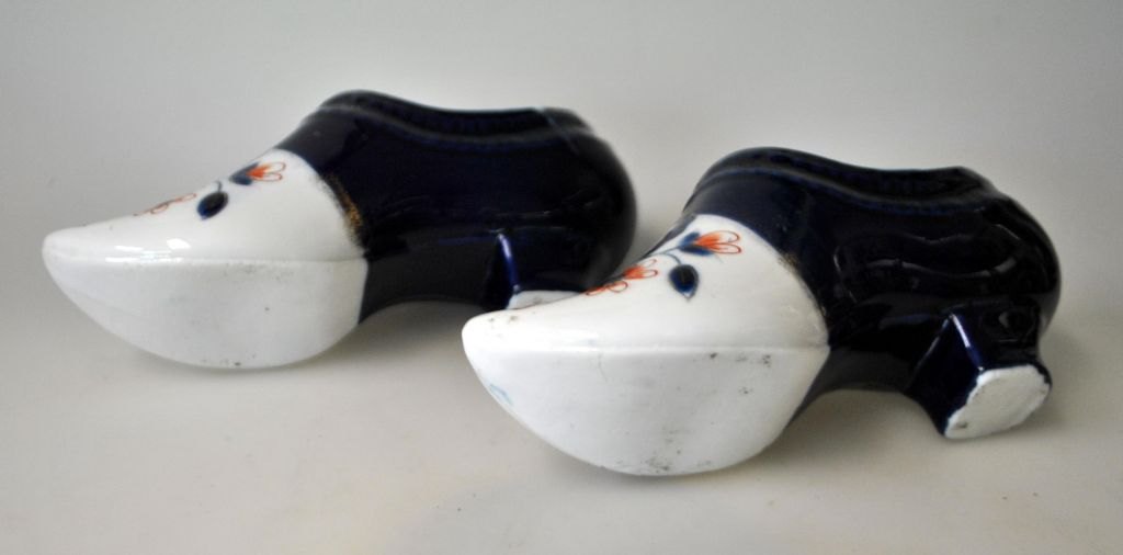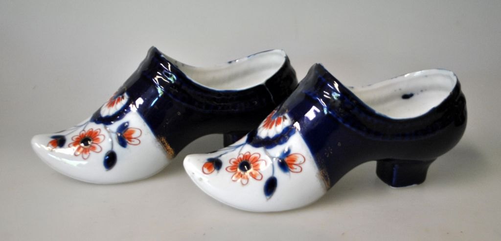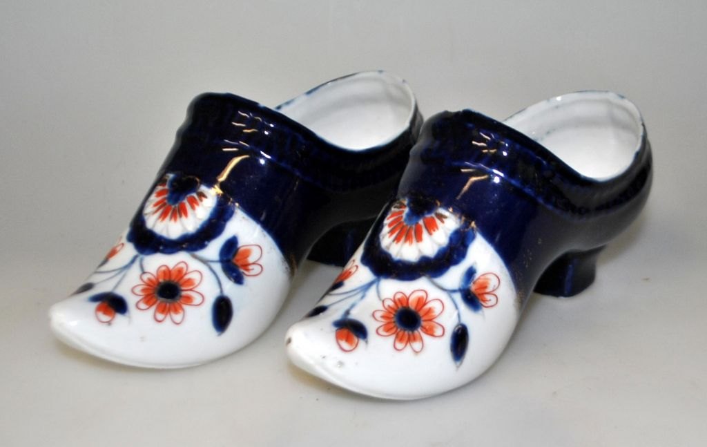 Et par Japanske imari sko i porcelæn til synåle, 19. årh. Dekoreret i blåt, rødt og forgyldt. L.: 16 cm. H.: 6,5 cm.
