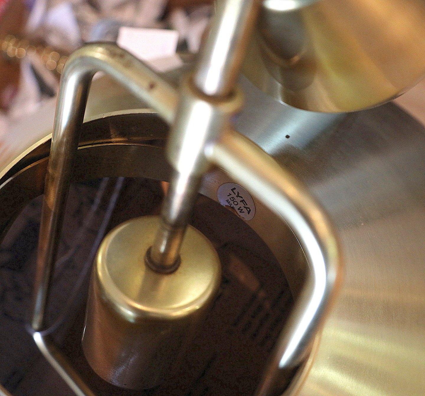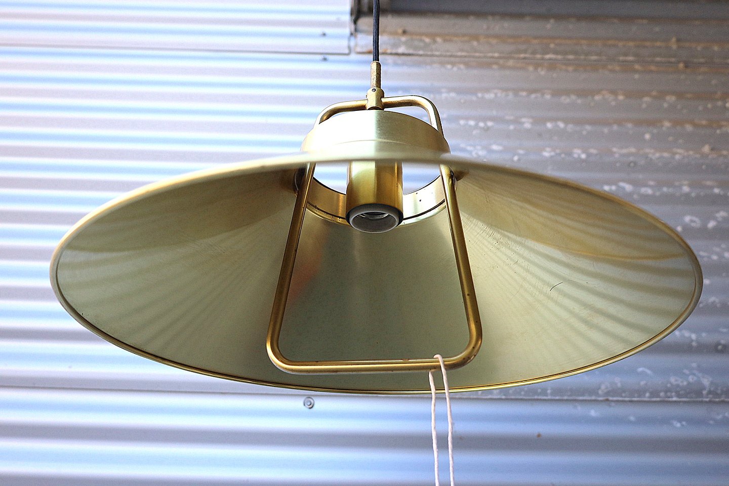 Lyfa. Fritz Schlegel for Lyfa. Retro pendel med hejs. Pendlen er af lakeret messing og mat, hvid lakeret indvendig. Hejse funktion og baldakin er også af messing. Model P295