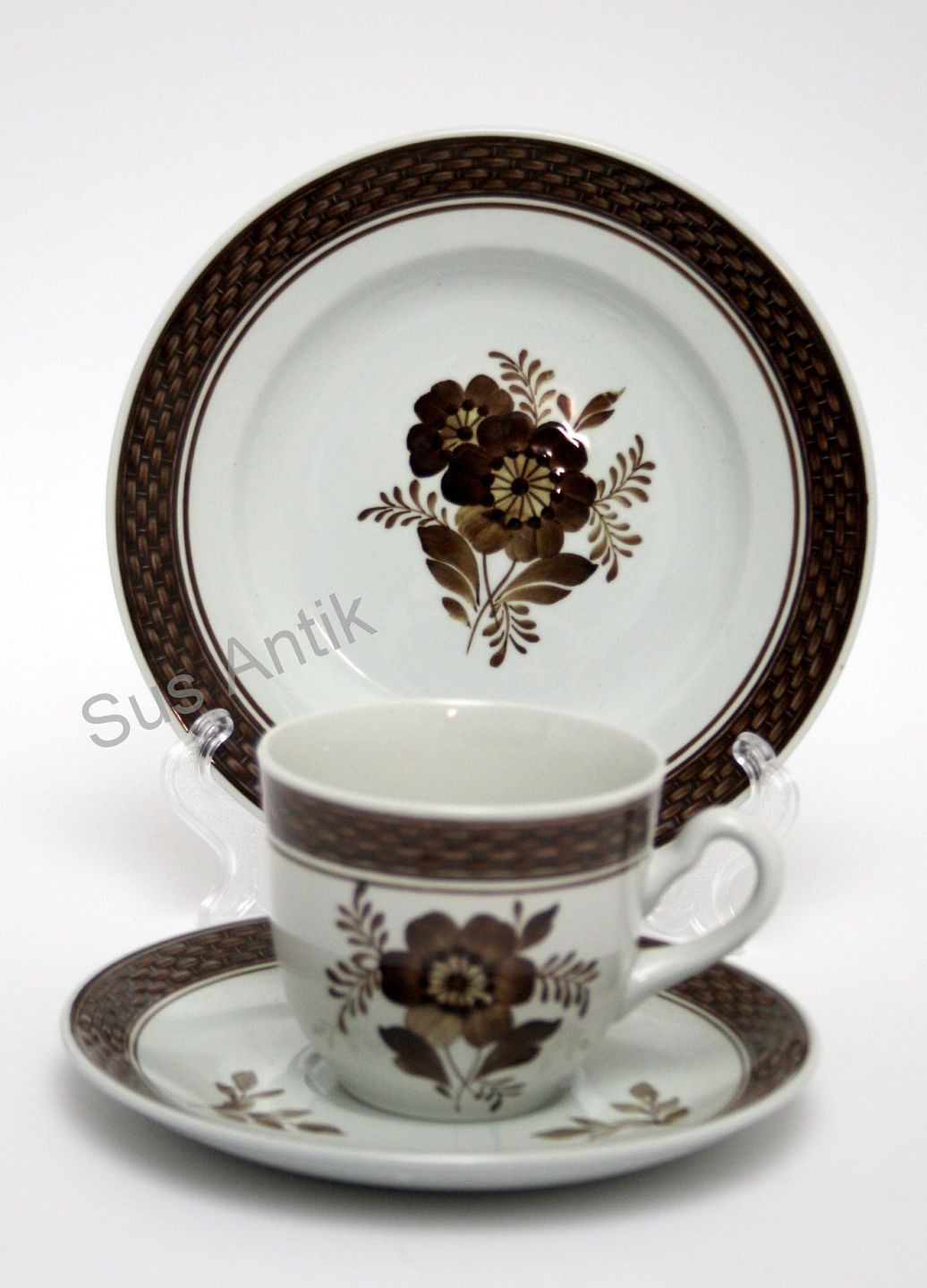 Text available in Danish: Royal Copenhagen, Tranquebar (Trankebar) fajance med brun tulipan og flettet bort designet af Christian Joachim. I. sortering.