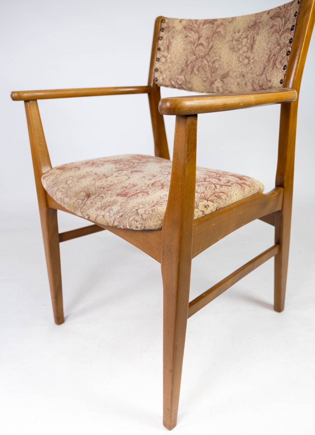 En armstol i teak og polstret med lyst stof, af dansk design fra 1960'erne, udstråler en tidløs elegance og enkelhed, der kendetegner den skandinaviske designtradition fra denne æra. Stolen er et smukt eksempel på dansk håndværk og møbelkunst fra perioden.