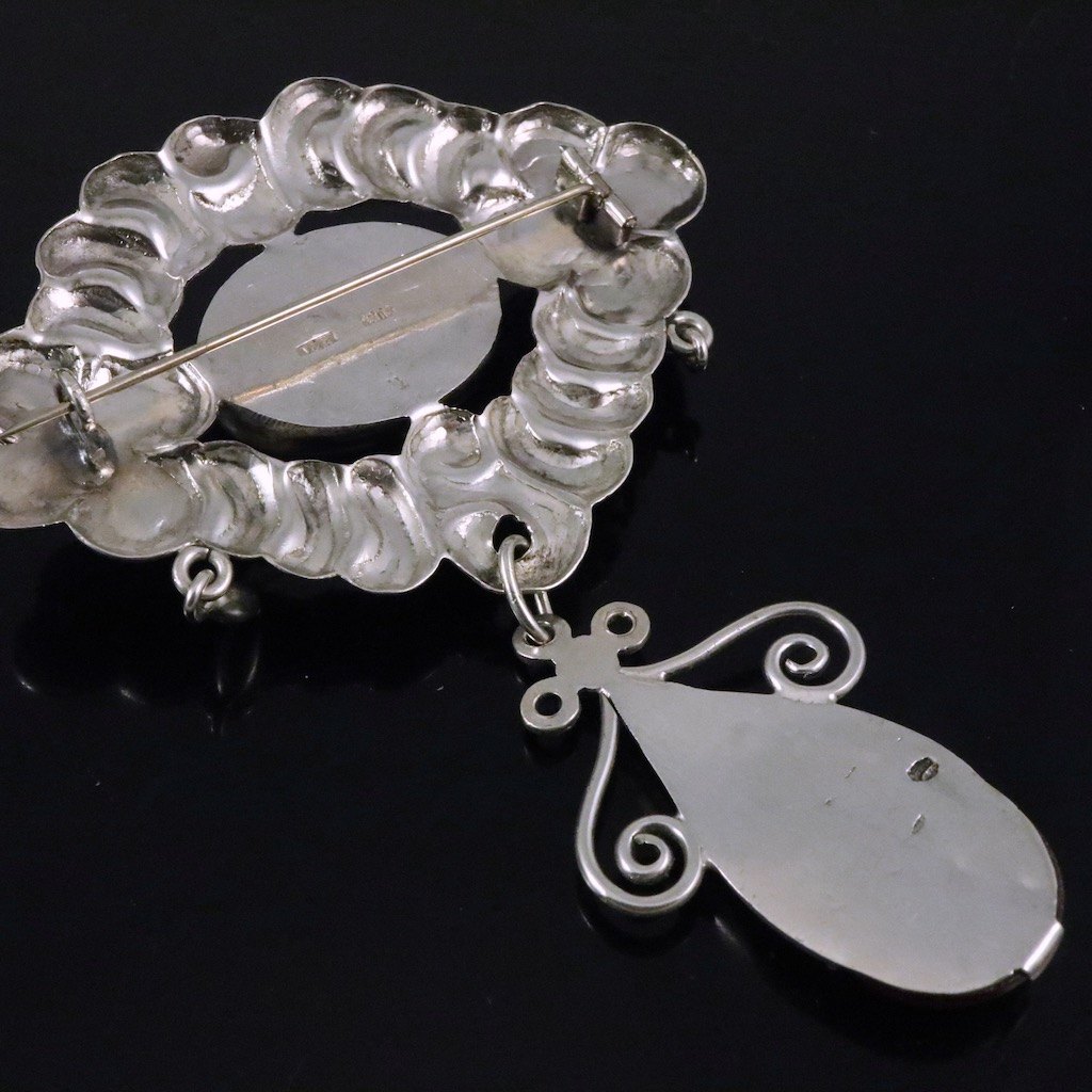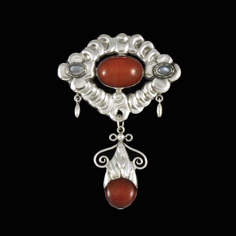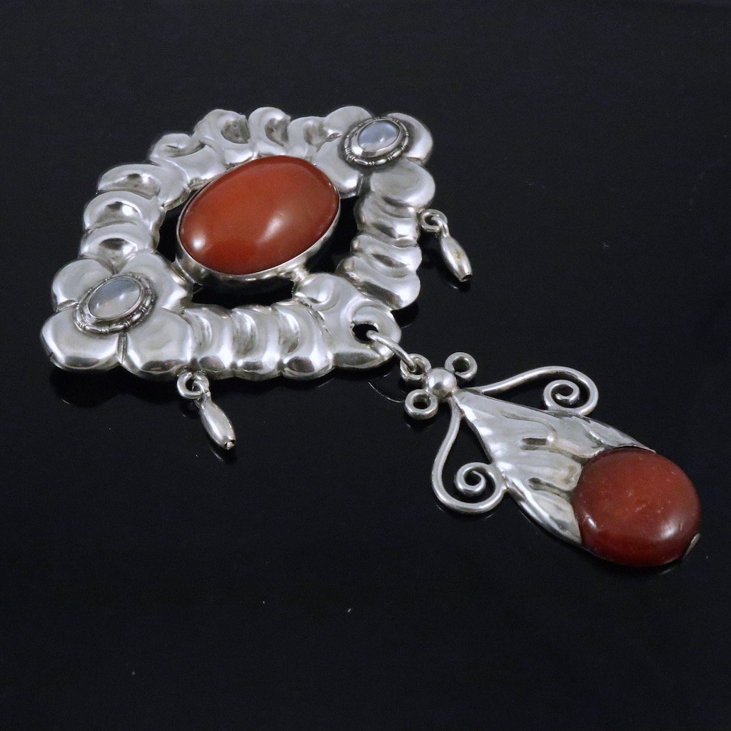Jensen & Akerlund. Skønvirke Broche i sølv med rav og månesten.