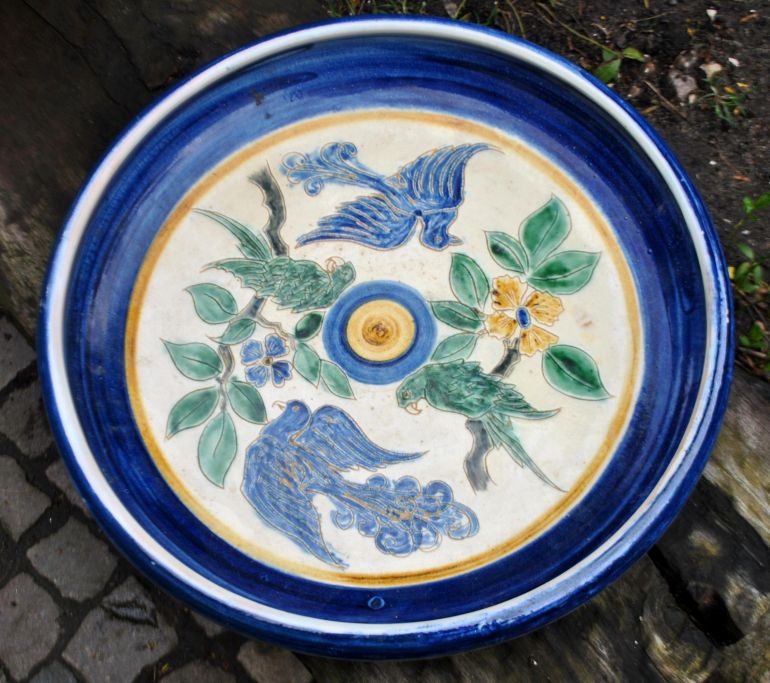 Dekoreret med duer og papegøjer. Signeret: PF. H: 6 cm. Dia.. 34,5 cm.