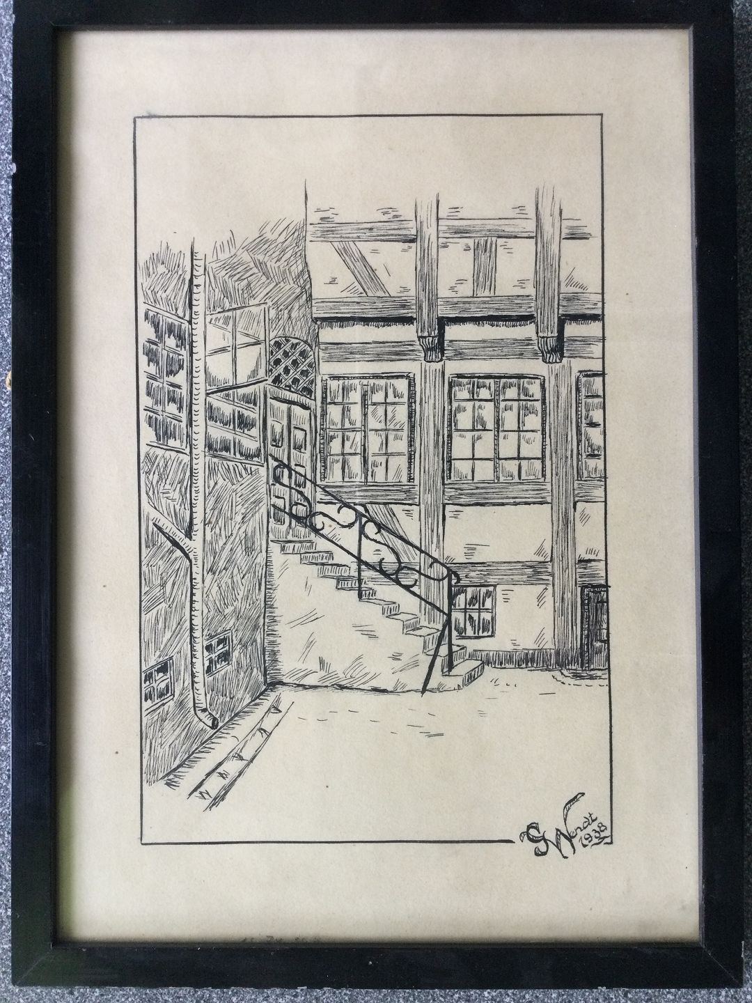 Tegning af G. Wendt - Bindingsværkshus 1938 - Gårdeksteriør.
