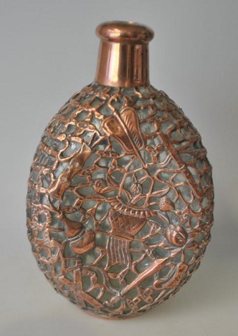 Antik whiskey flaske med kobber dekoration, 19./20. årh. Orientalsk arbejde. Hele flasken er dekoreret med mønstre og figur kompositioner, bla.a. kurv med blomster, sværd m.v. Højde.: 22 cm.