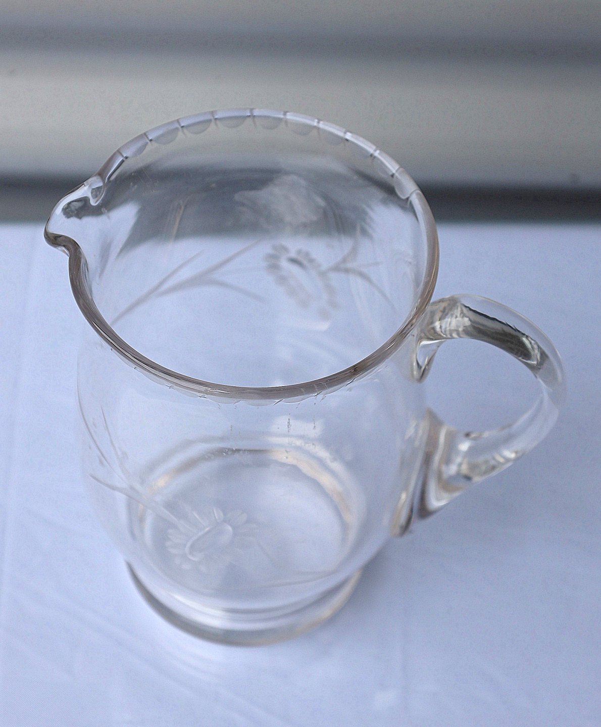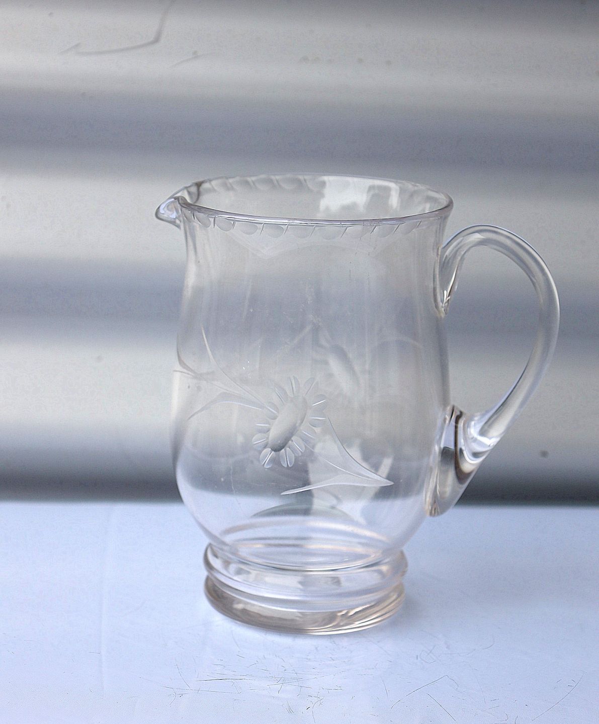 Holmegaard Glasværk. Kanden er slebet med blomster og blade, der er også små slibninger i øverste kant, hanken er påsat.
