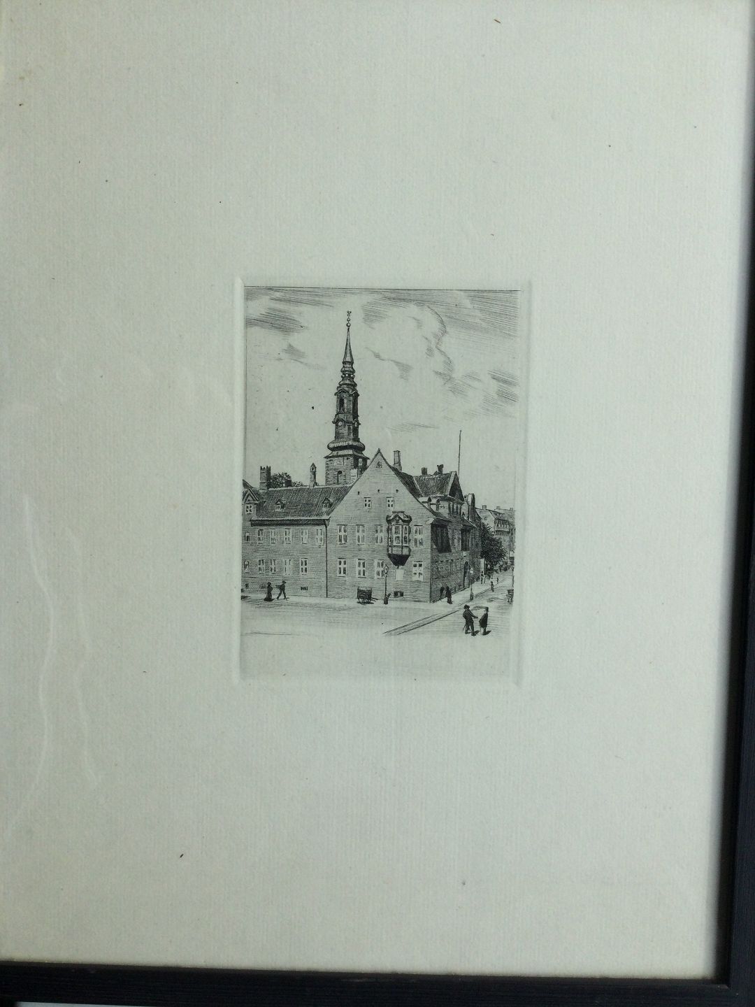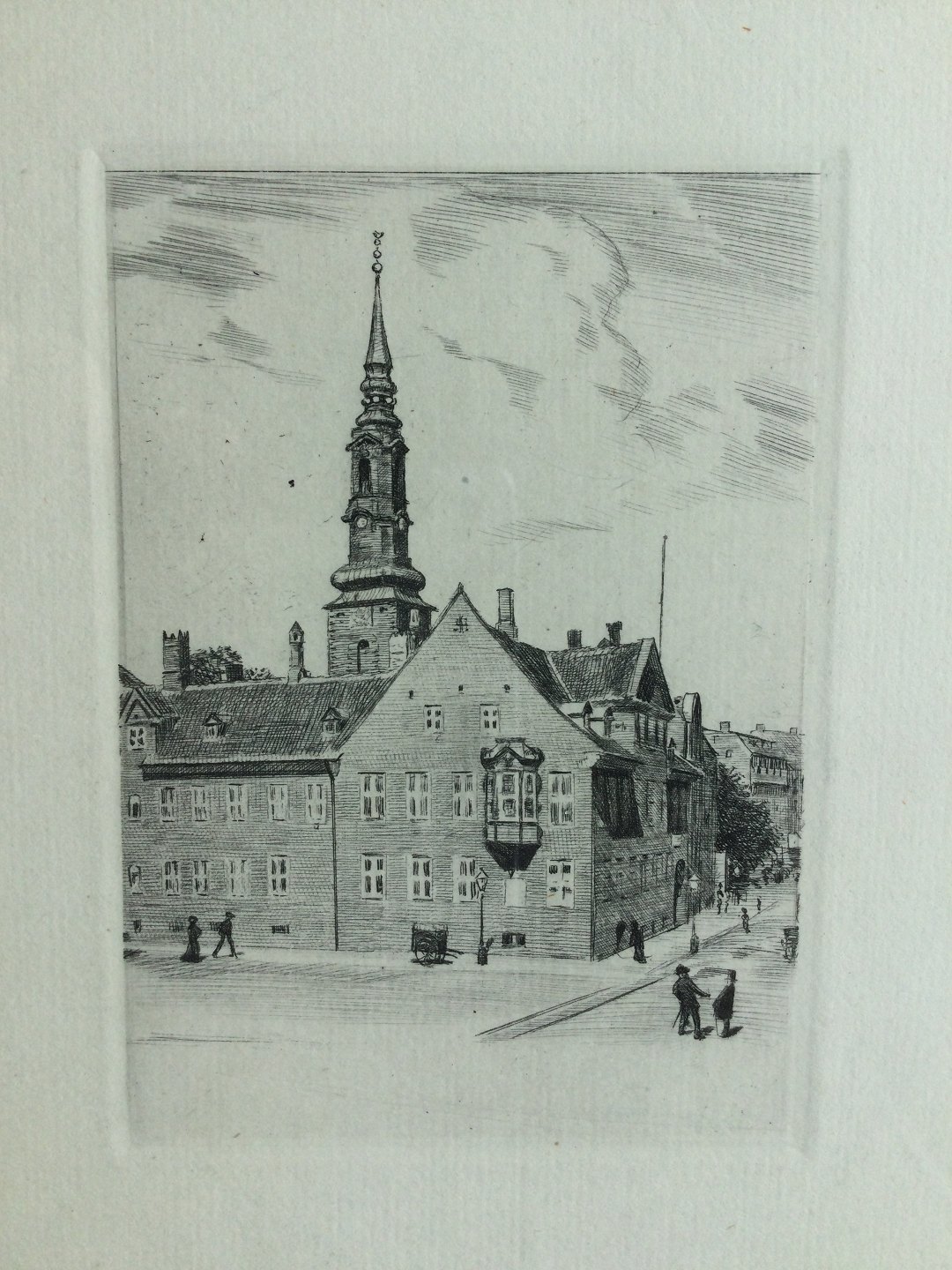 Bispetorvet og Nørregade med bispegården i København med Sankt Petri Kirke i baggrunden.