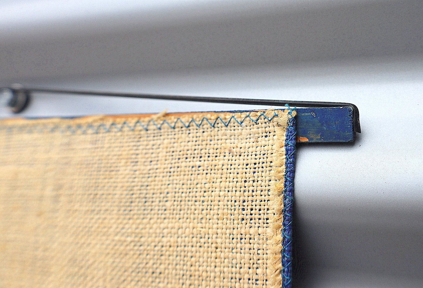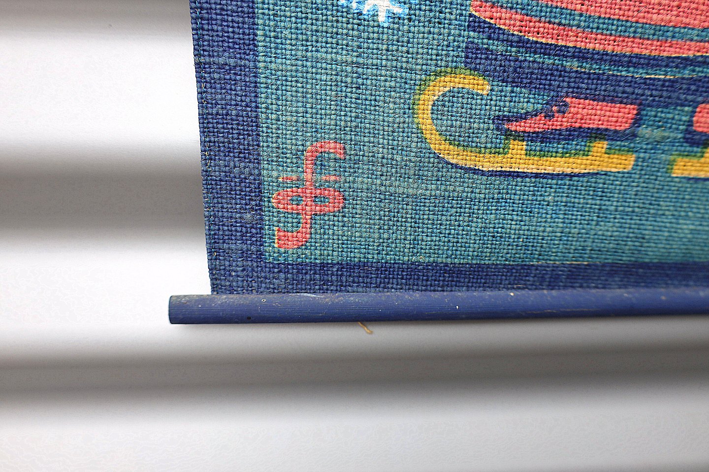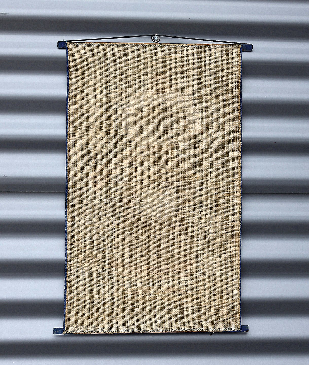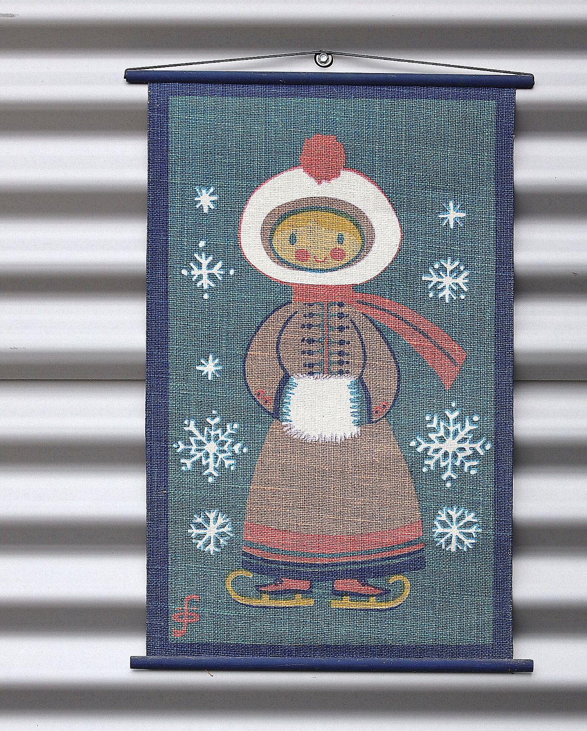 Væg ophæng, pige med muffedise og på skøjter. Ophæng trykt på sækkelærred, syet, med siksak sting, på ophængspinde, gummiophænget er sømmet på pinden.