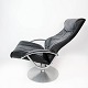 Lænestol med skammel polstret i sort læder og stel af metal, af Dansk design fra 1970erne.