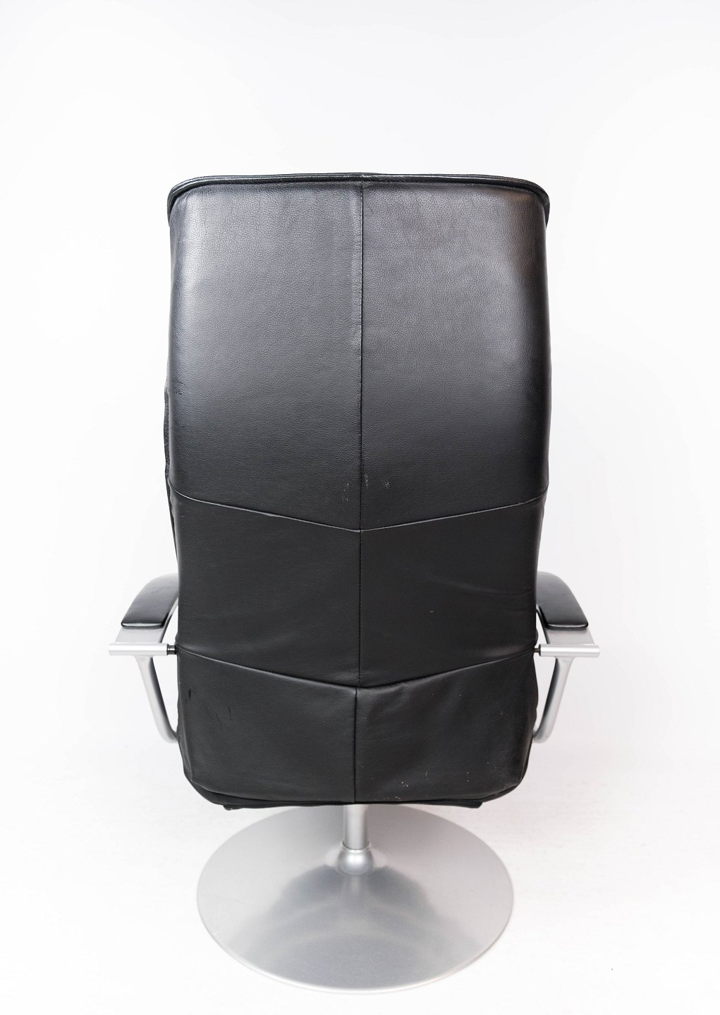 Lænestol med skammel polstret i sort læder og stel af metal, af Dansk design fra 1970erne. Sættet er i flot brugt stand.