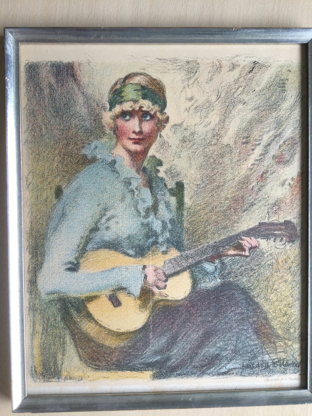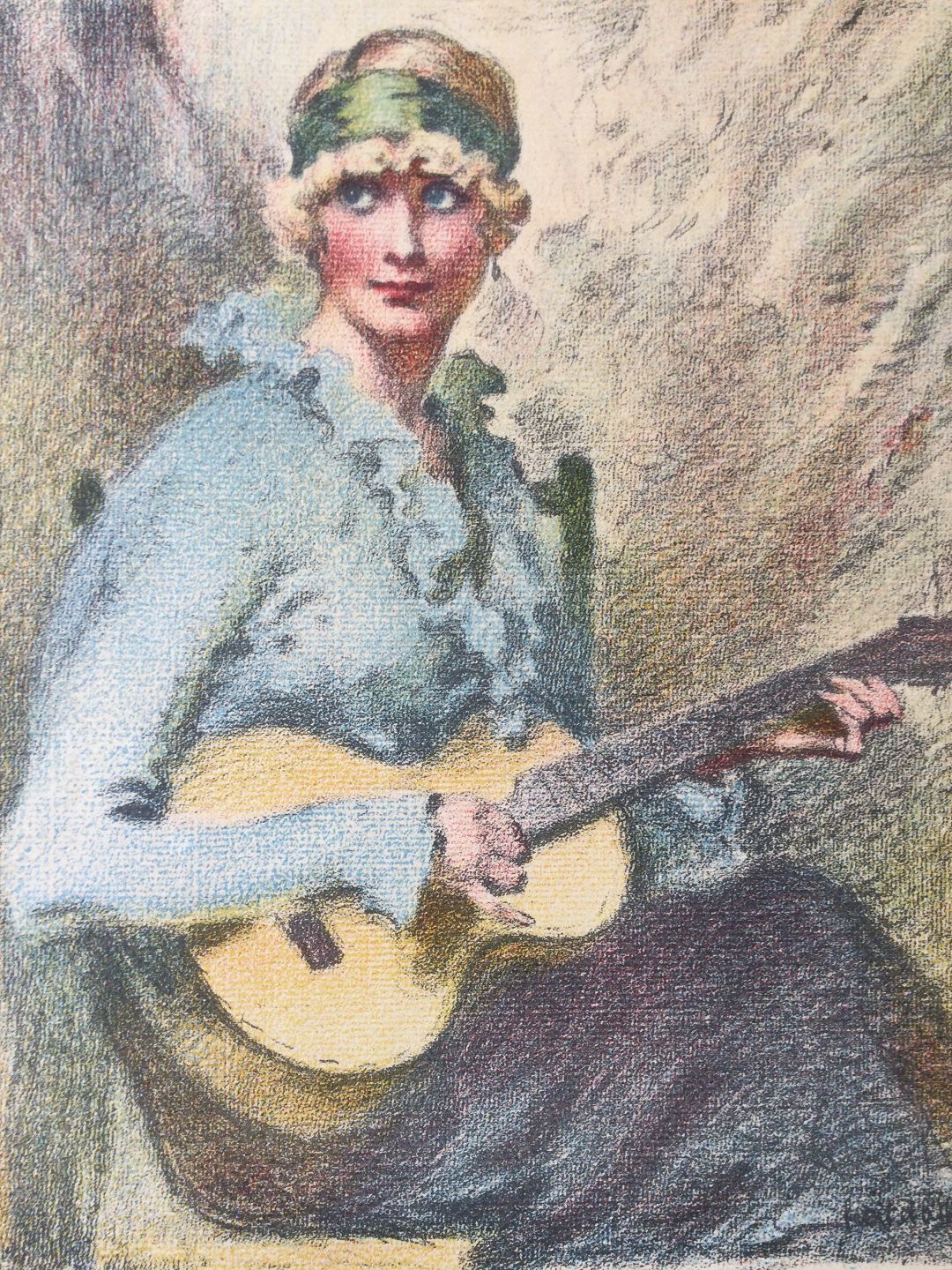 Farvelitografi af Frantisek Xaver Naske - Guitarspillende kvinde.