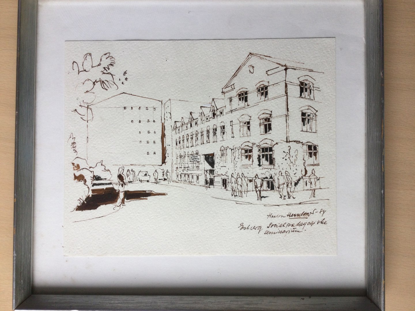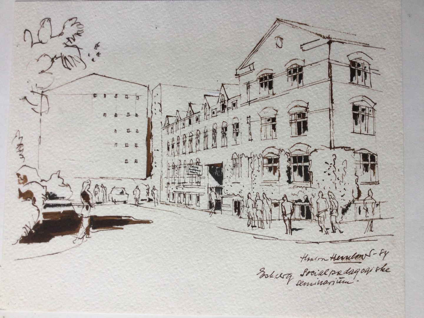 Tegning af Haakon Hesselager - Esbjerg Socialpædagogiske Seminarium 1984.