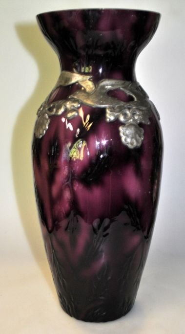 Art Nouveau vase in white opaline glass with violet surface, approx. 1900. Decoration in the form of branches and leaves. Exterior in pewter with decoration of birds. H .: 31.5 cm.