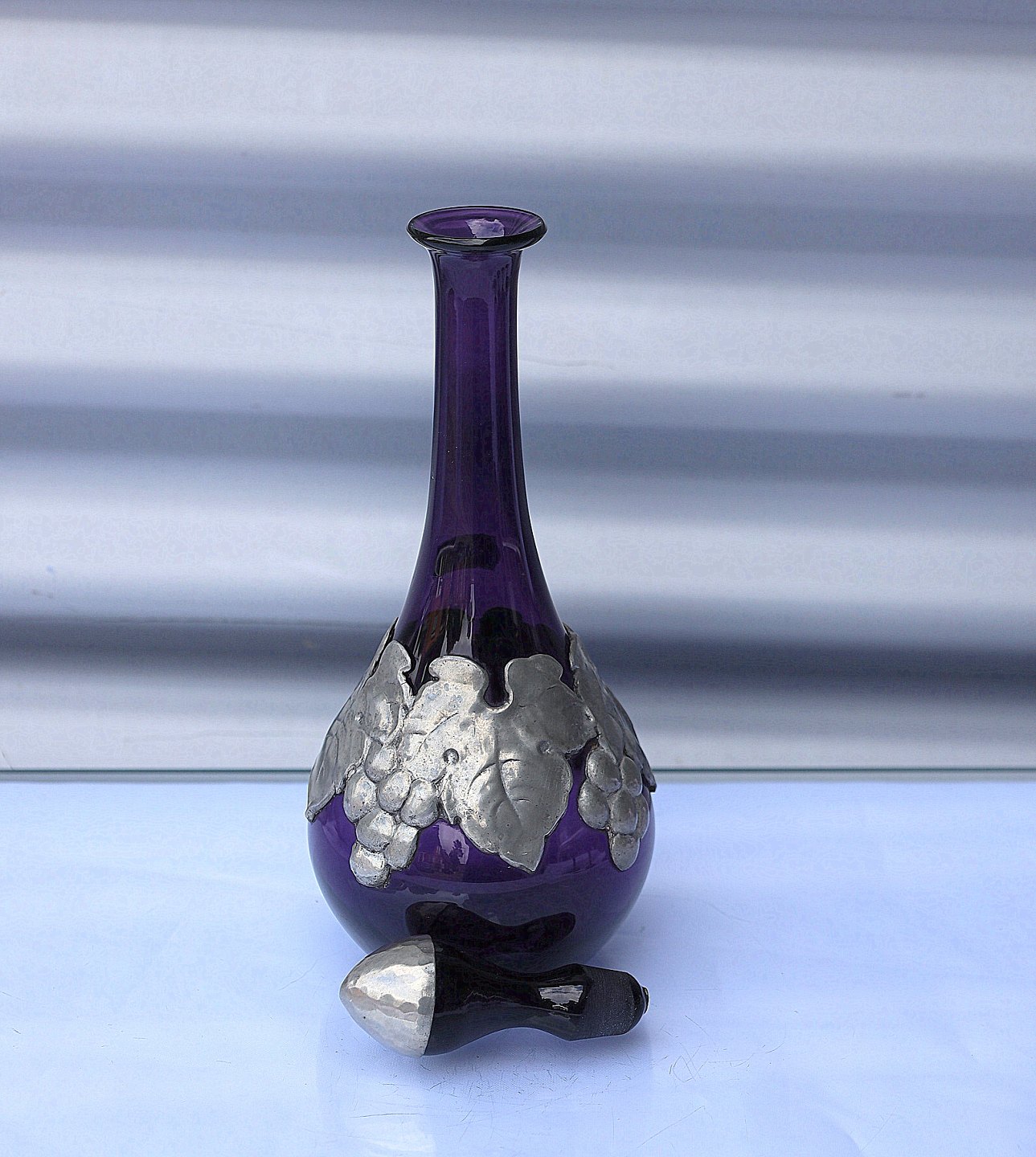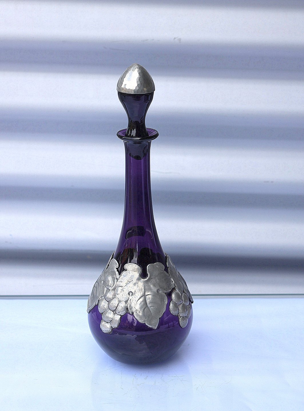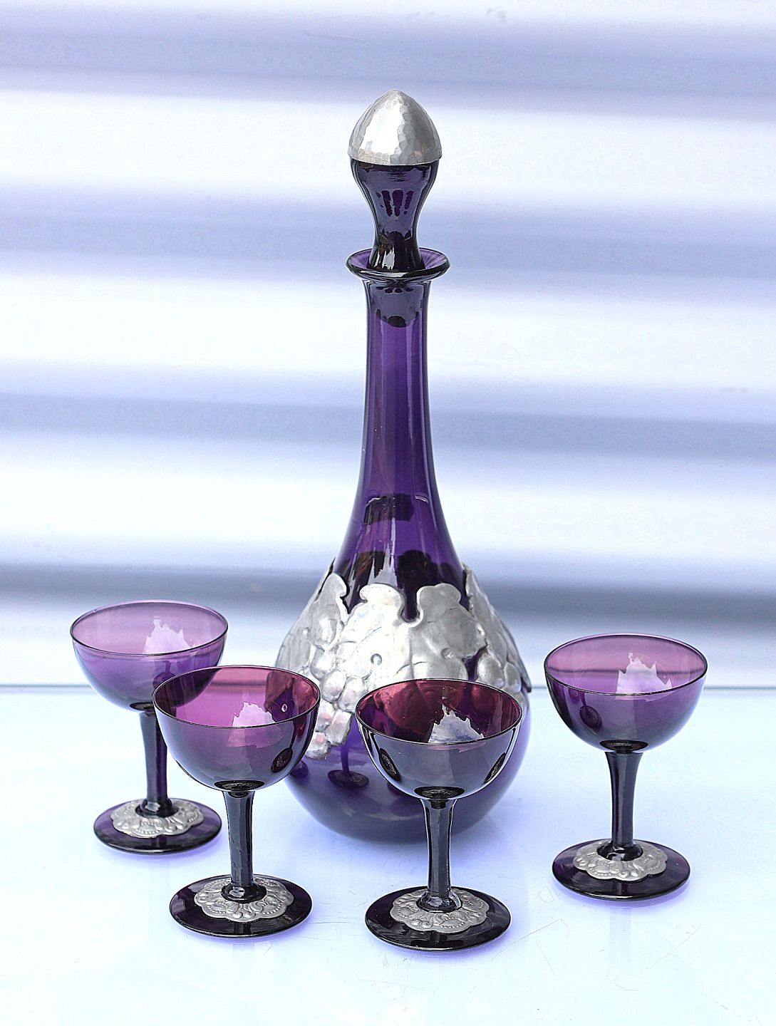 Aubergine farvet karaffel med tin og 4 glas. Karaffel og glas har tin monteringer. På karaflen er det i form af drueranker og blade, glassene har tin montering på foden.