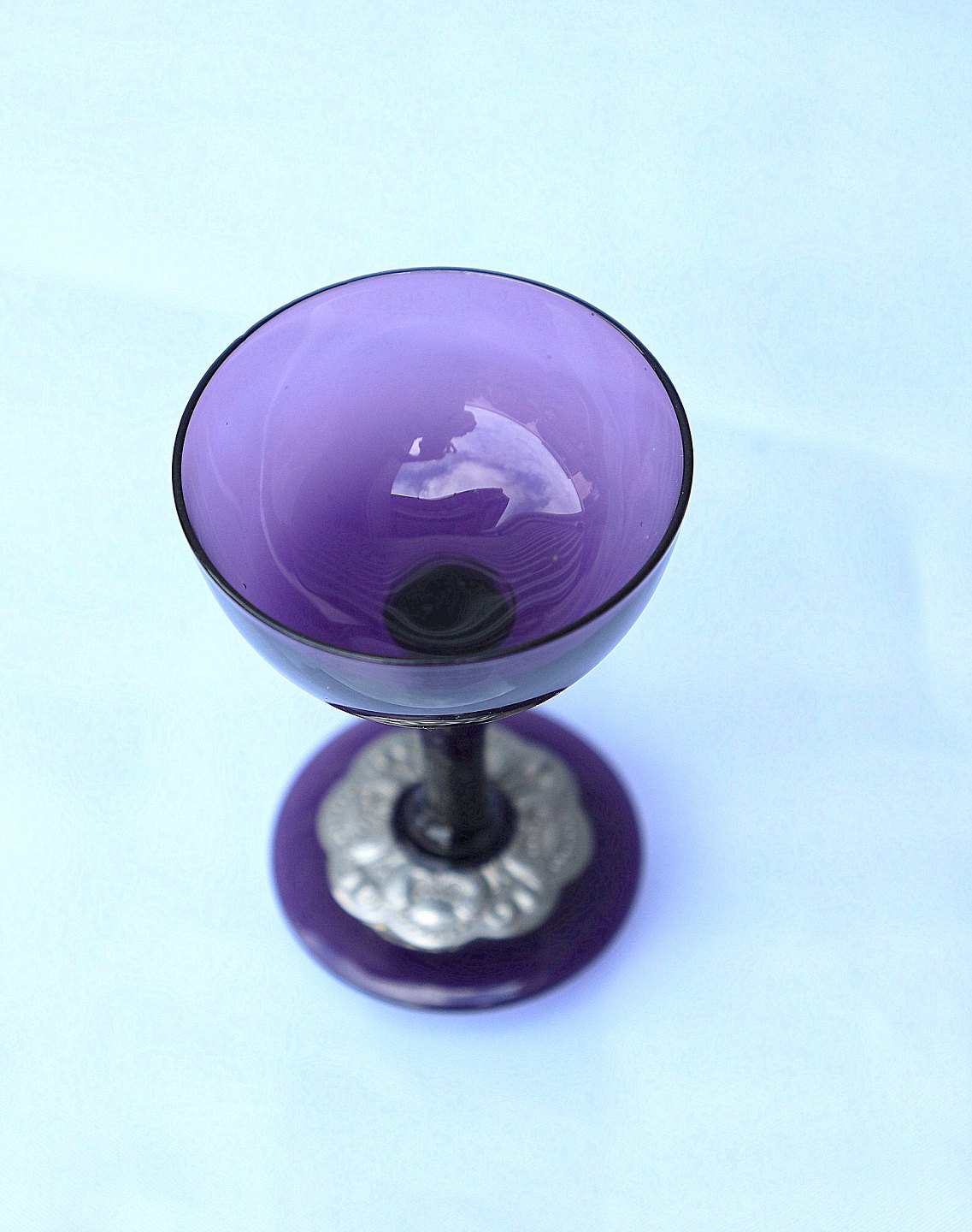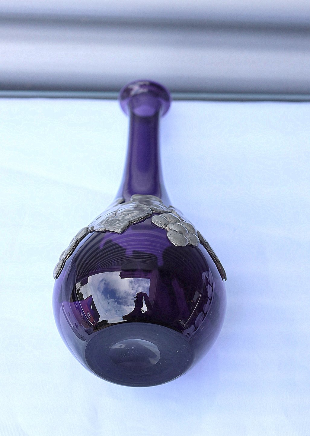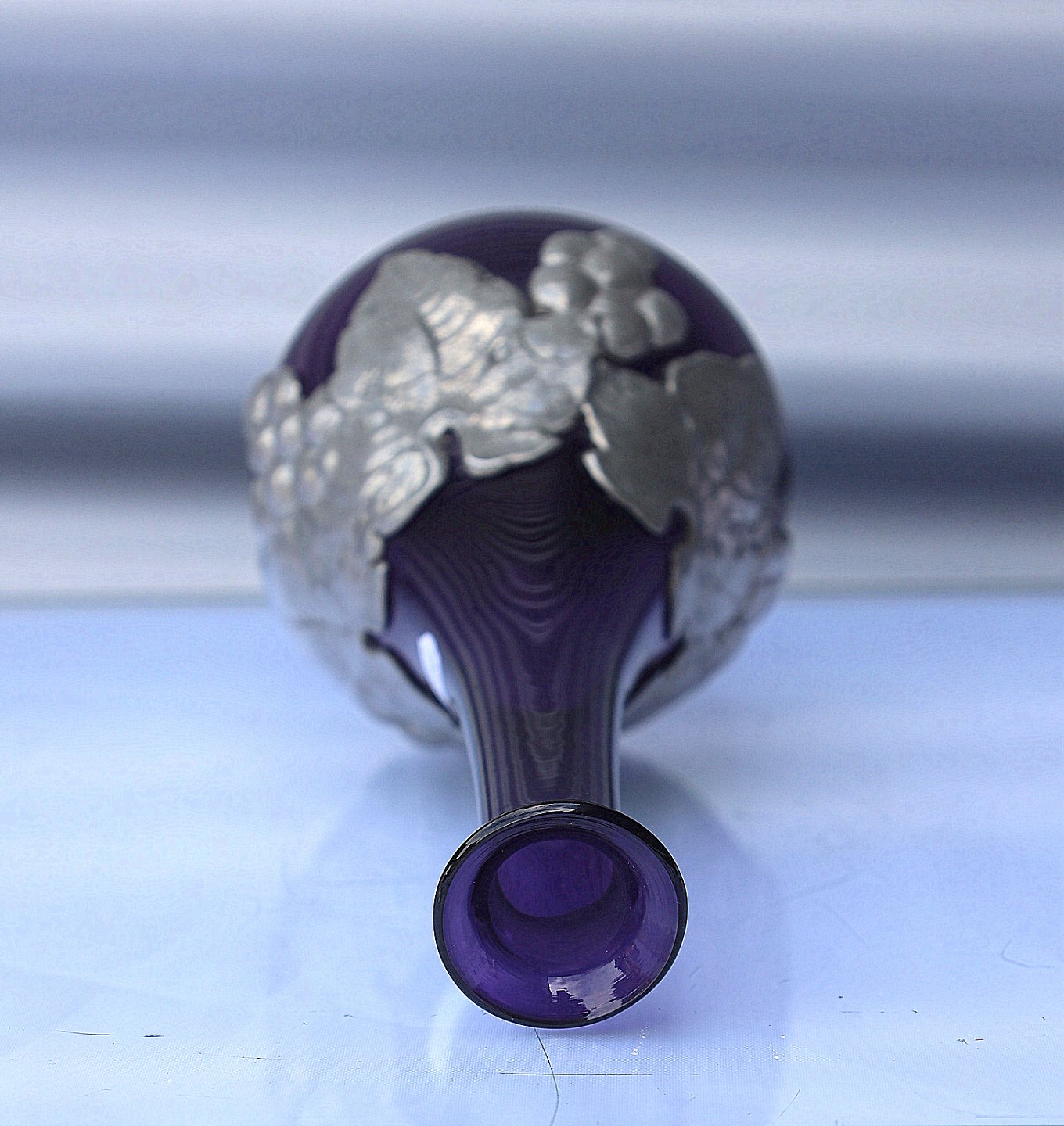 Aubergine farvet karaffel med tin og 4 glas. Karaffel og glas har tin monteringer. På karaflen er det i form af drueranker og blade, glassene har tin montering på foden.