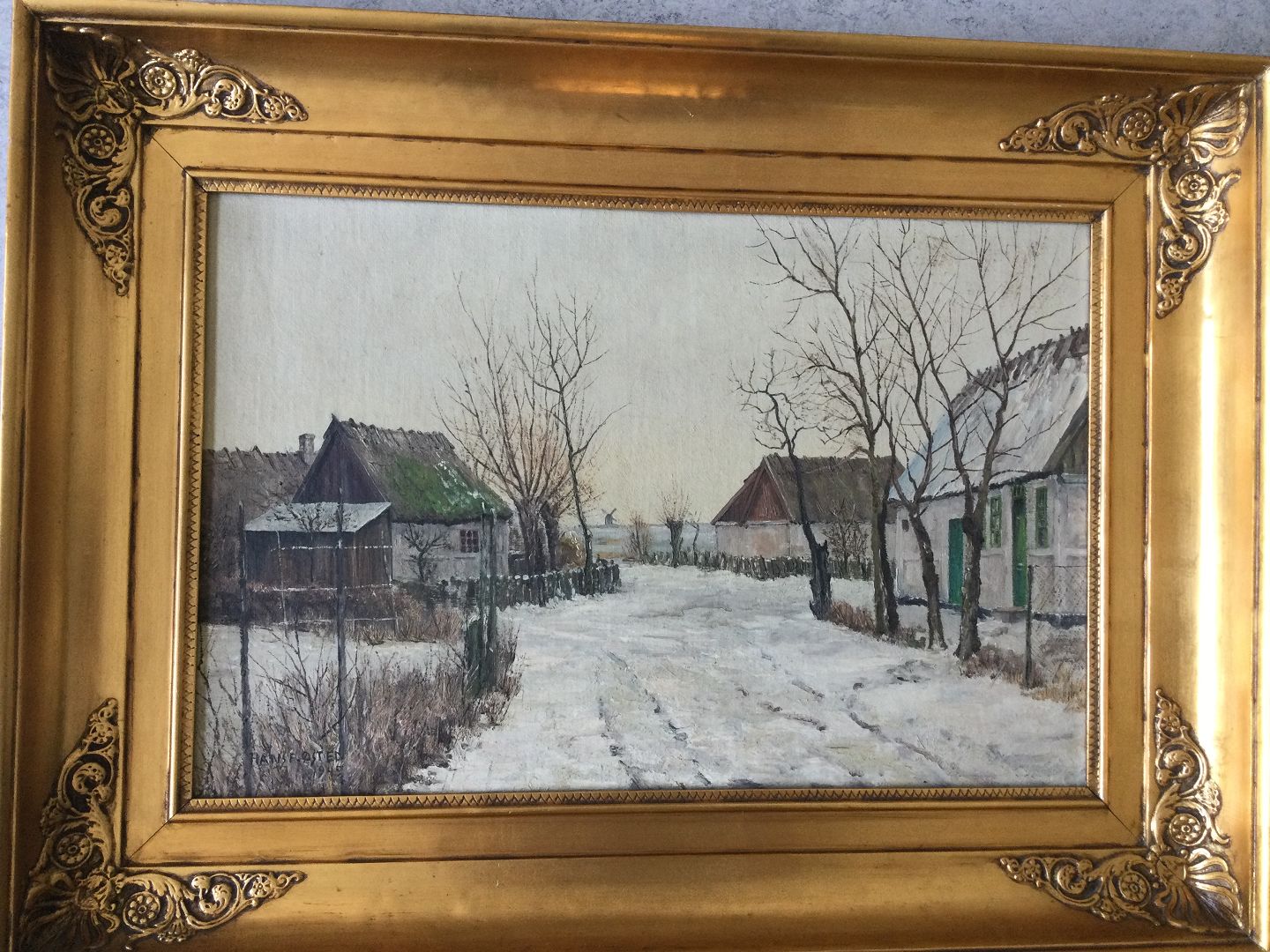 Text zugänglich auf Dänische: Maleri af Hans F. Østed - Vinterparti fra Enegårde 1945.