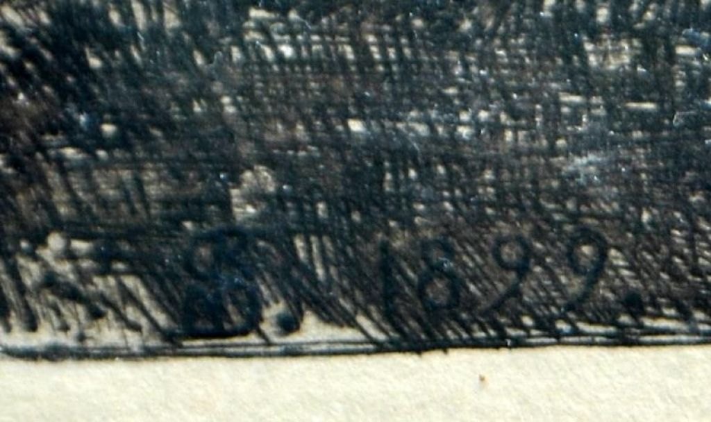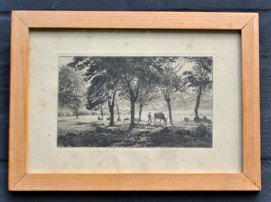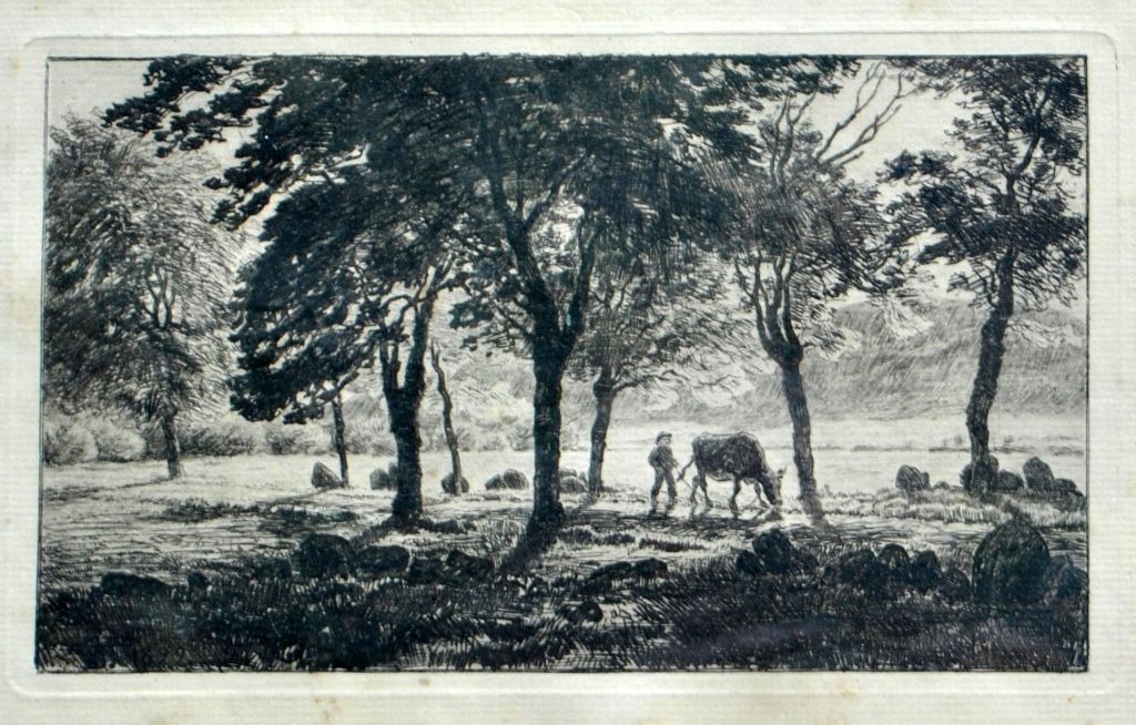 Skovgaard, Niels Christian (1858 - 1938) Denmark. A man with a cow on the road. Etching. Signed: Monogram 1899. 12.5 x 20 cm.
