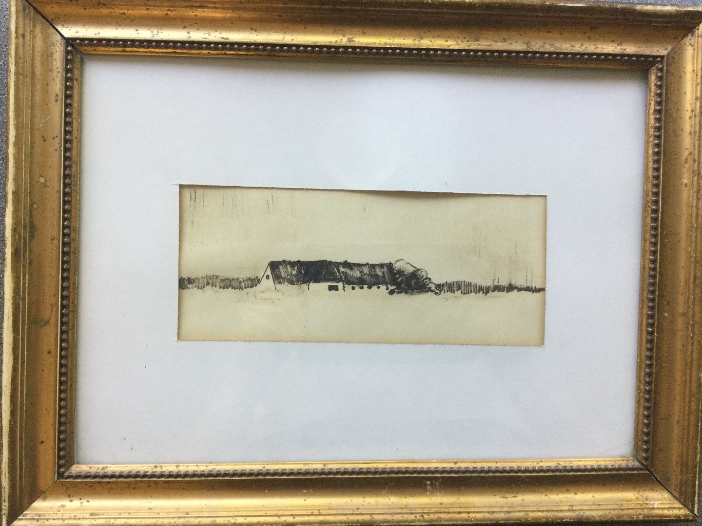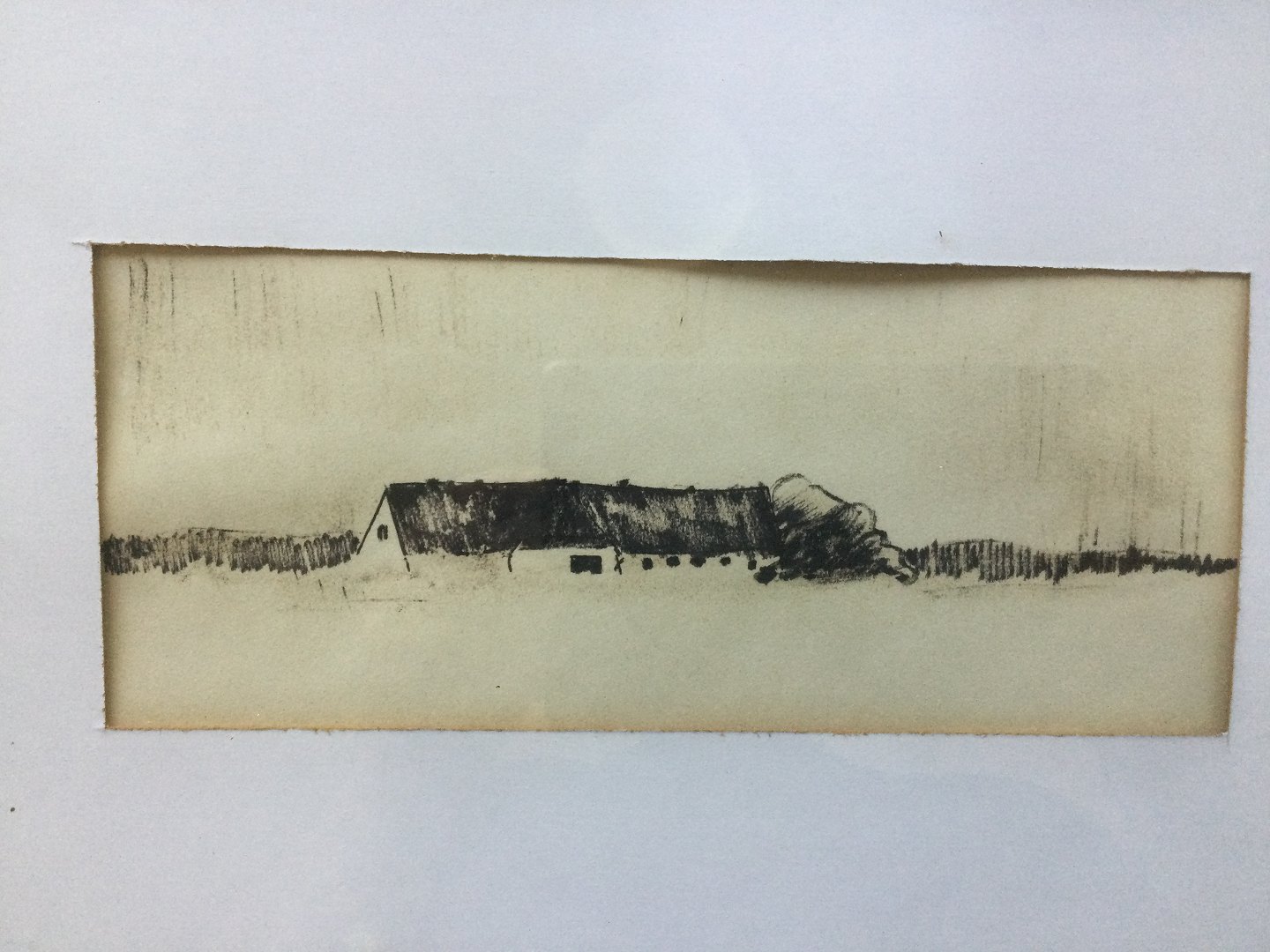 Tegning - Bondegård i landskab.