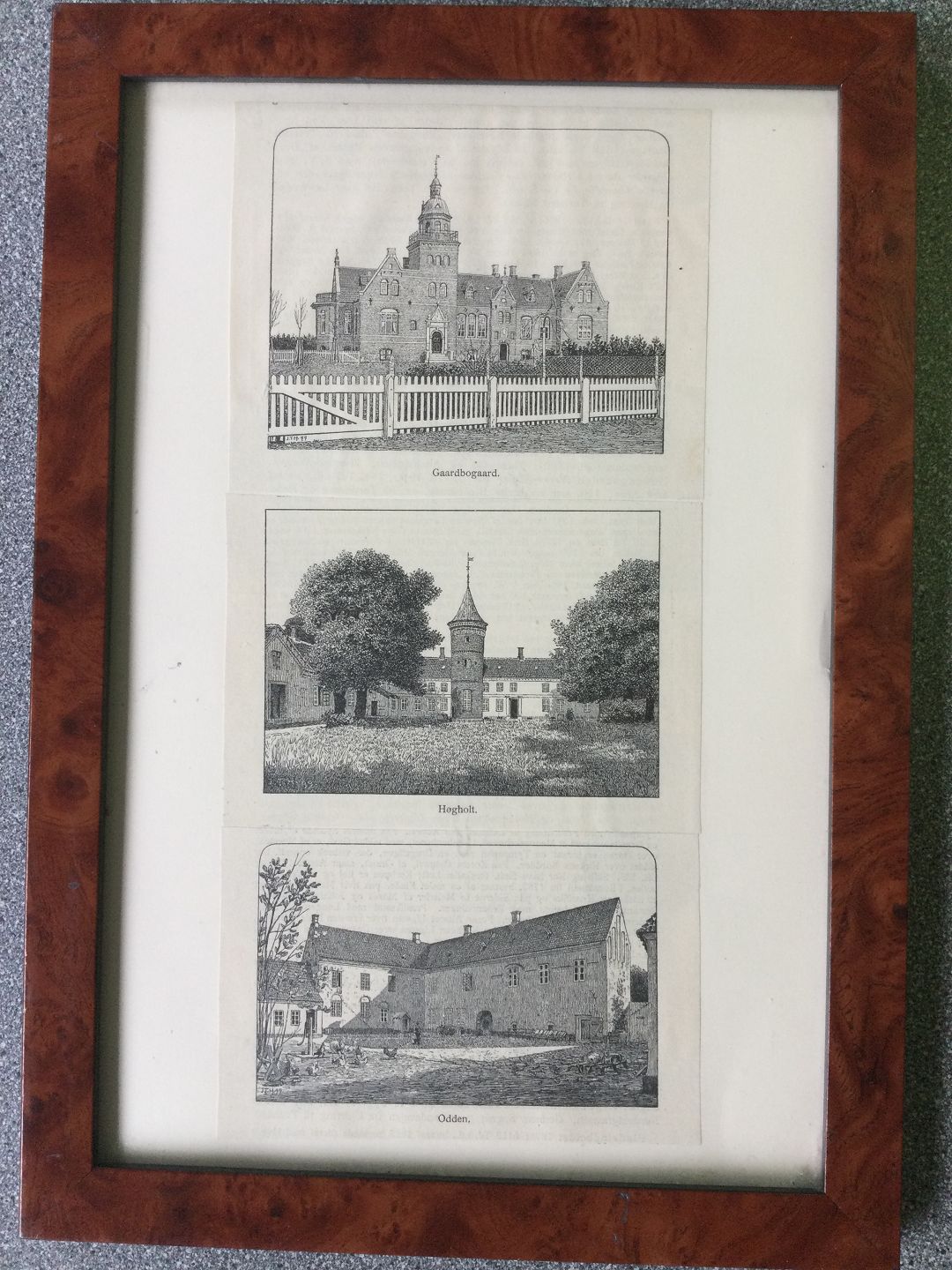 3 små xylografier i samme ramme.
