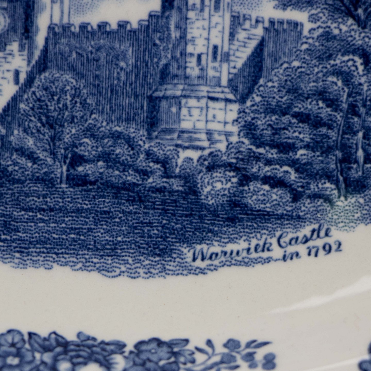 Skål i lys fajance med blådekoreret slotsmotiv.