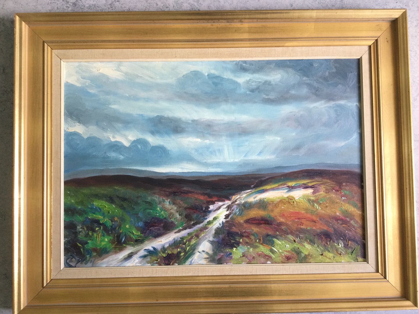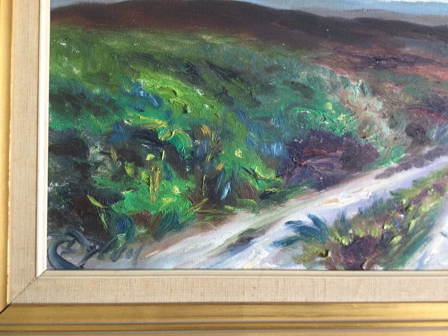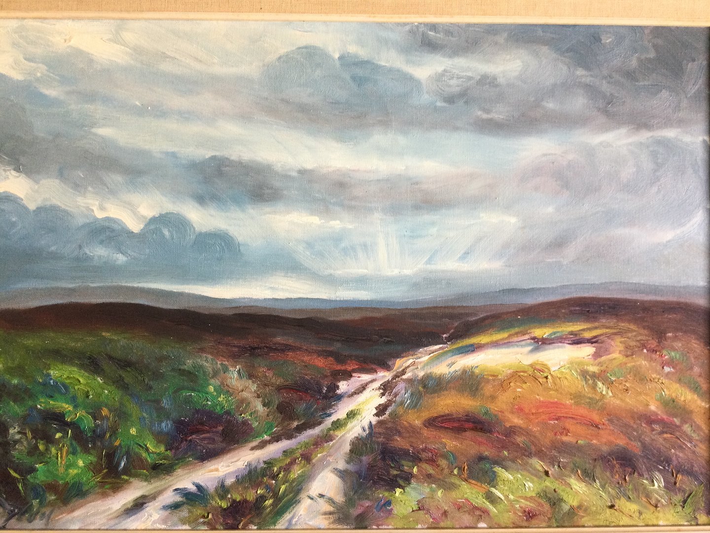 Text available in Danish: Maleri af Chr. Dybdal - Vej gennem heden - inspireret af den franske impressionisme.