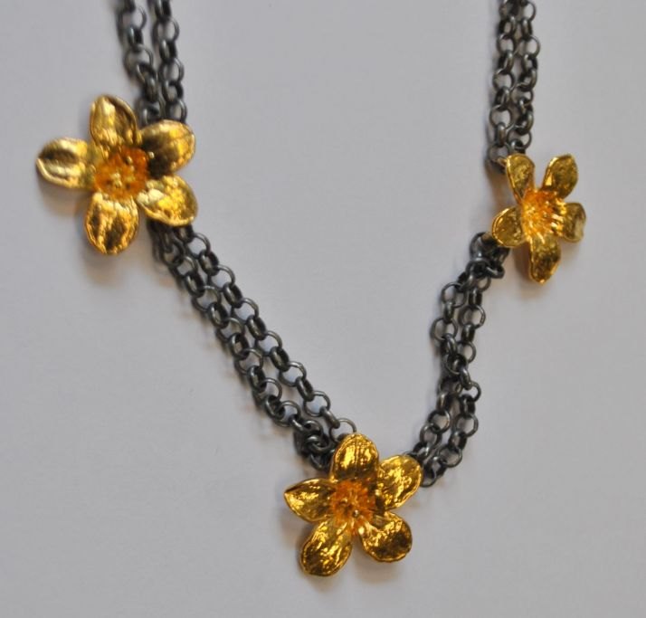 Sterling dobbeltradet halskæde med forgyldte blomster, 20. årh. Danmark. Stemplet: EDJ og 925 s. L.:42 cm.