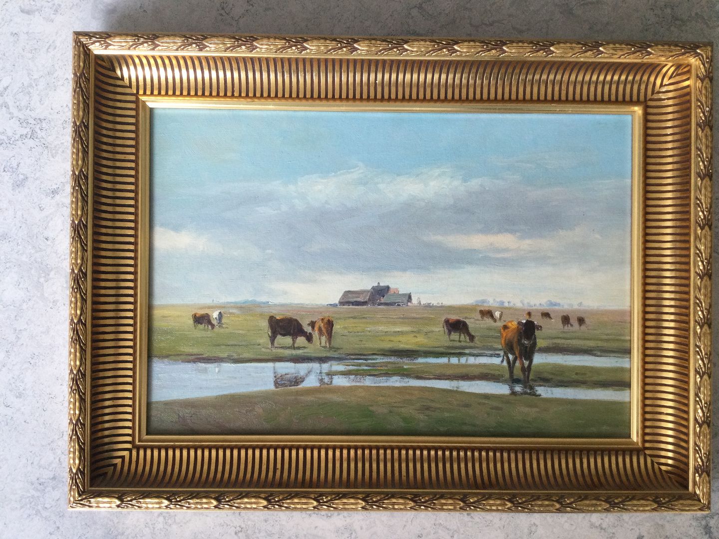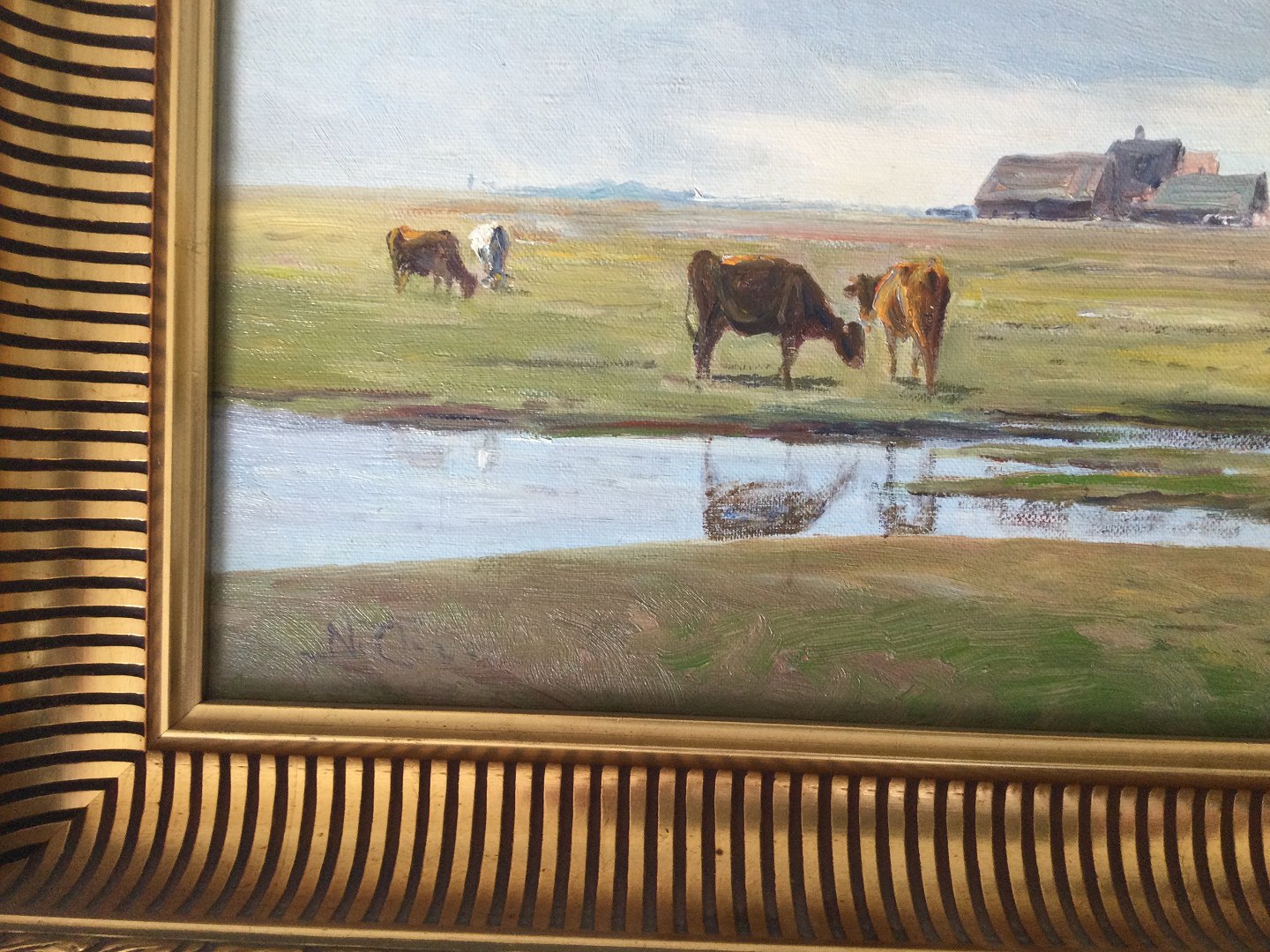 Maleri af Niels Christiansen - Køer og kvier på engen.