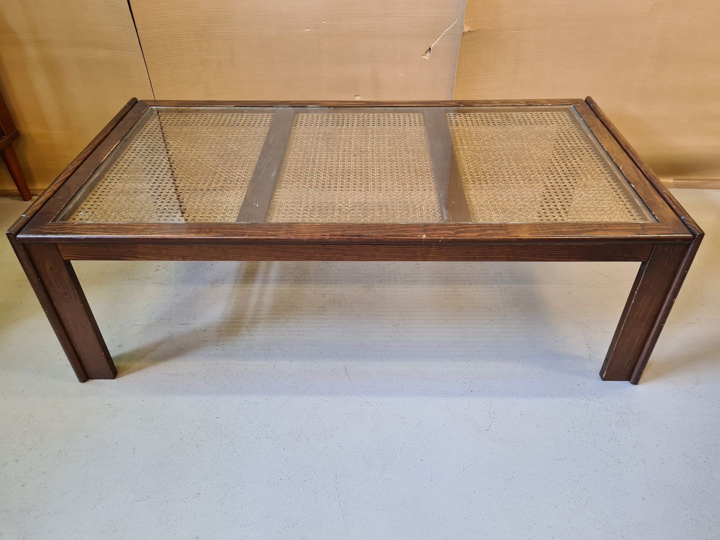 Sofabord i bejset og lakeret fyrretræ med flet og glasplade.