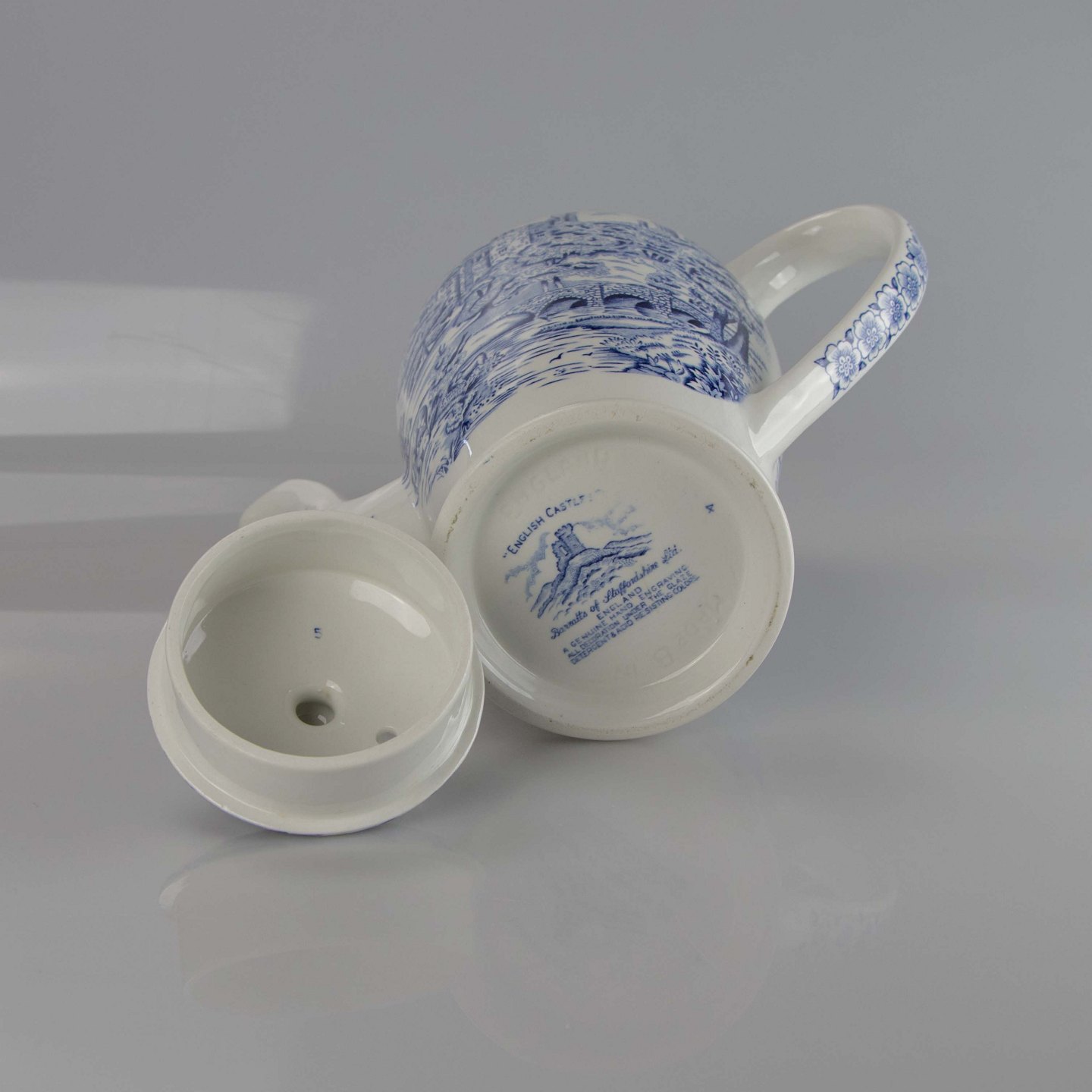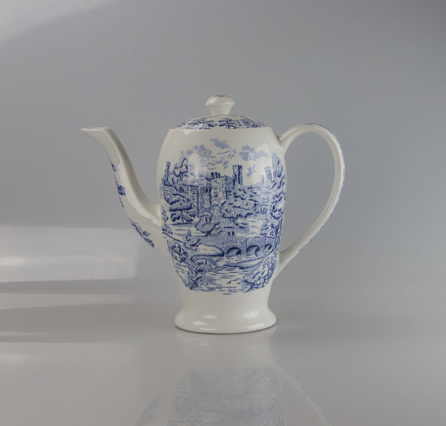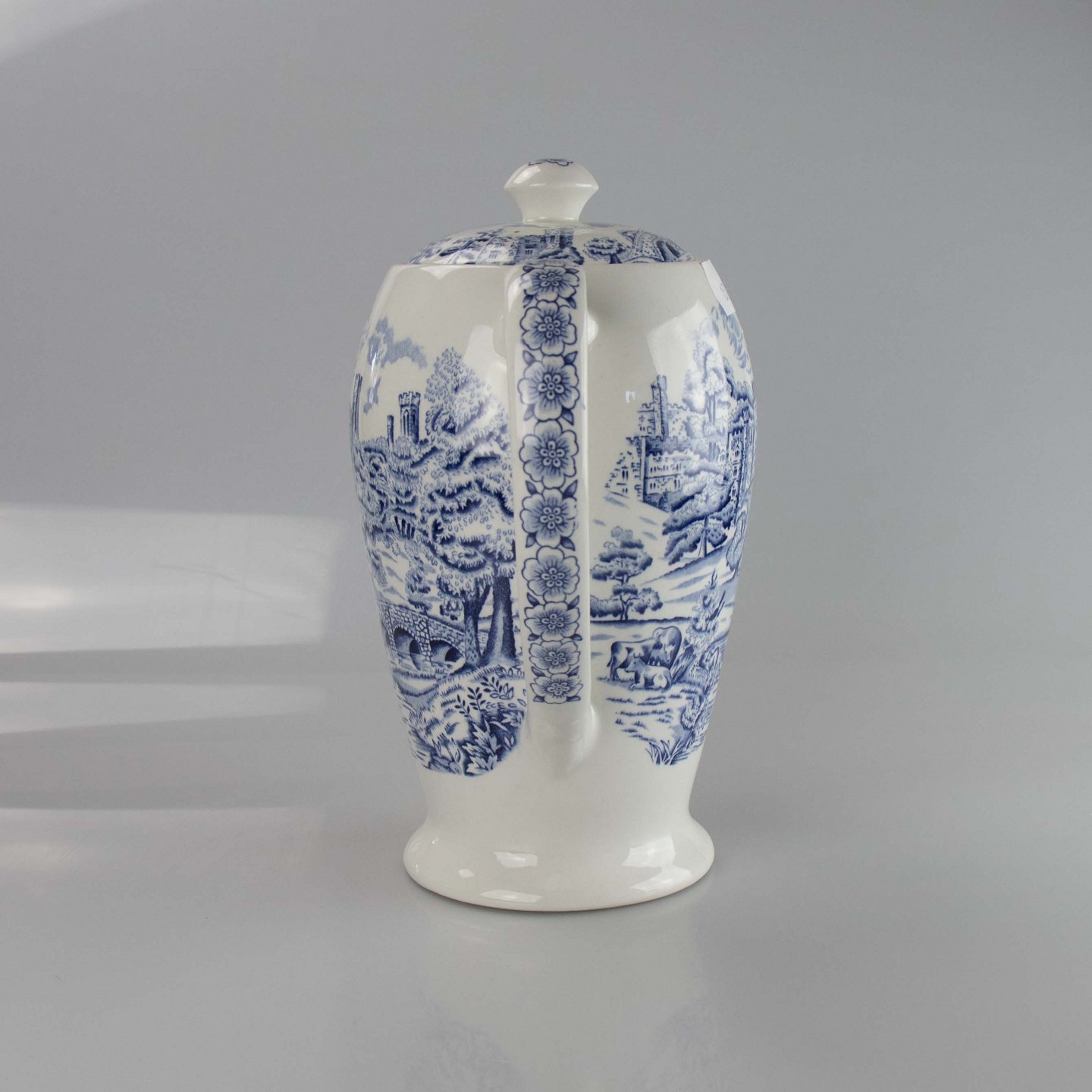 Kande i lys fajance med blådekoreret slotsmotiv.