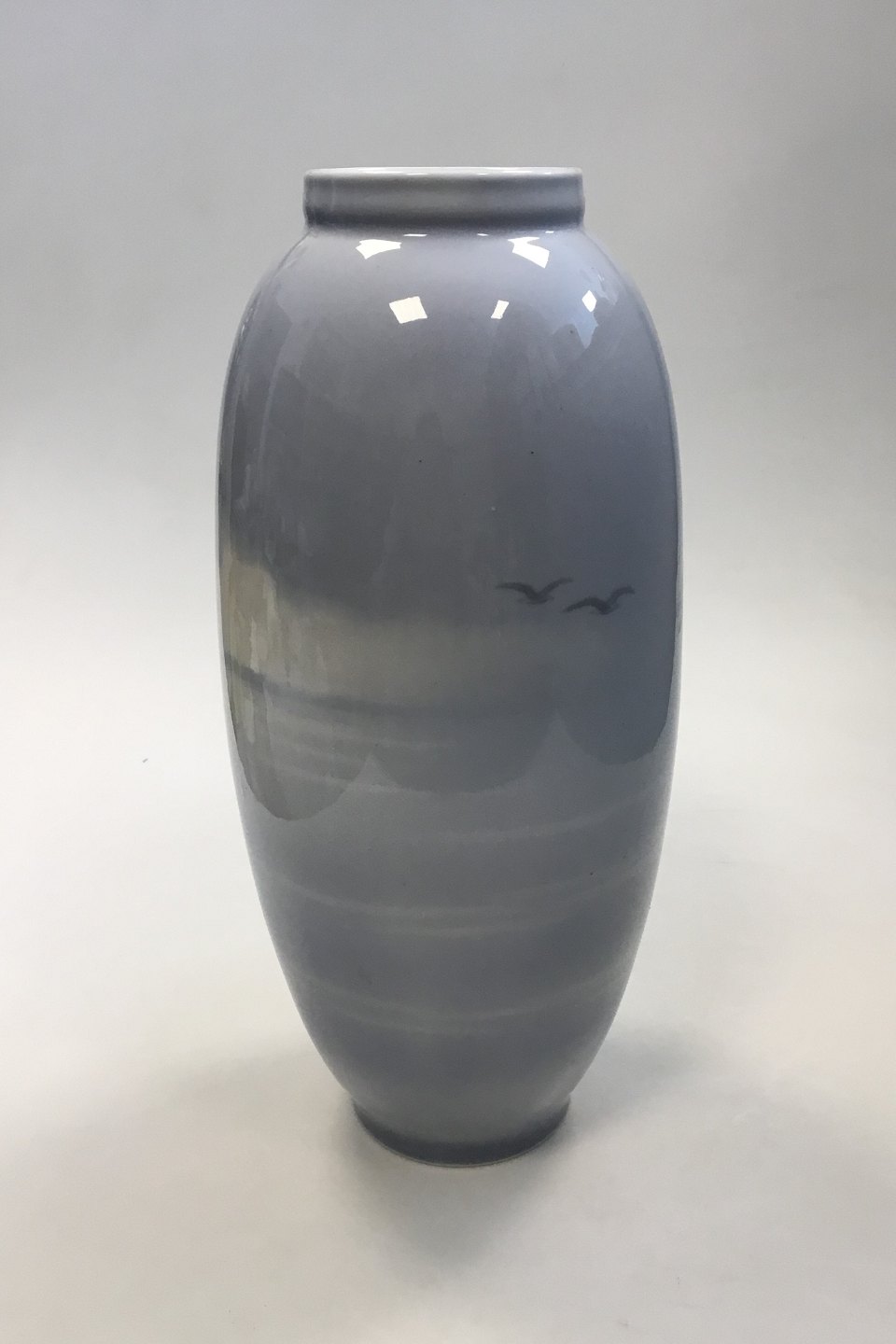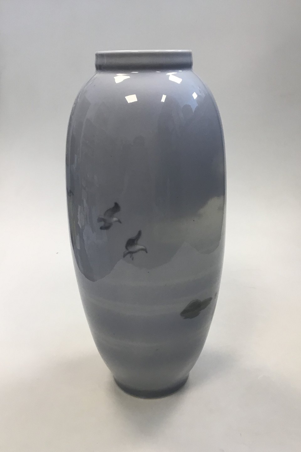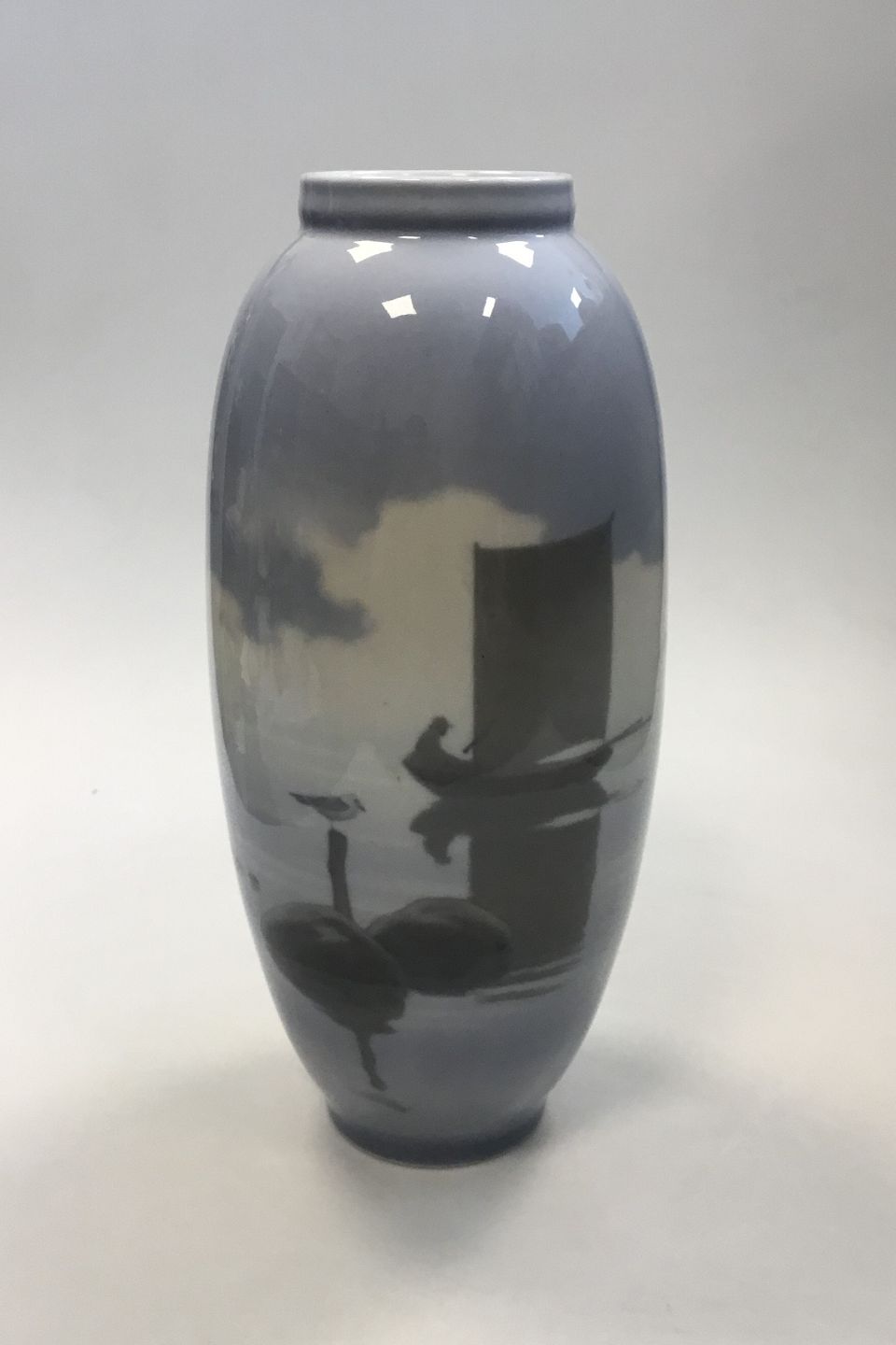 Royal Copenhagen Art Nouveau Unikavase dekoreret med havmiljø med båd og måge. Dateret 24/1-1928, signeret RB for Richardt Bøtcher og Juliane Marie mærke. Måler 36 cm (14 11/64 in.)