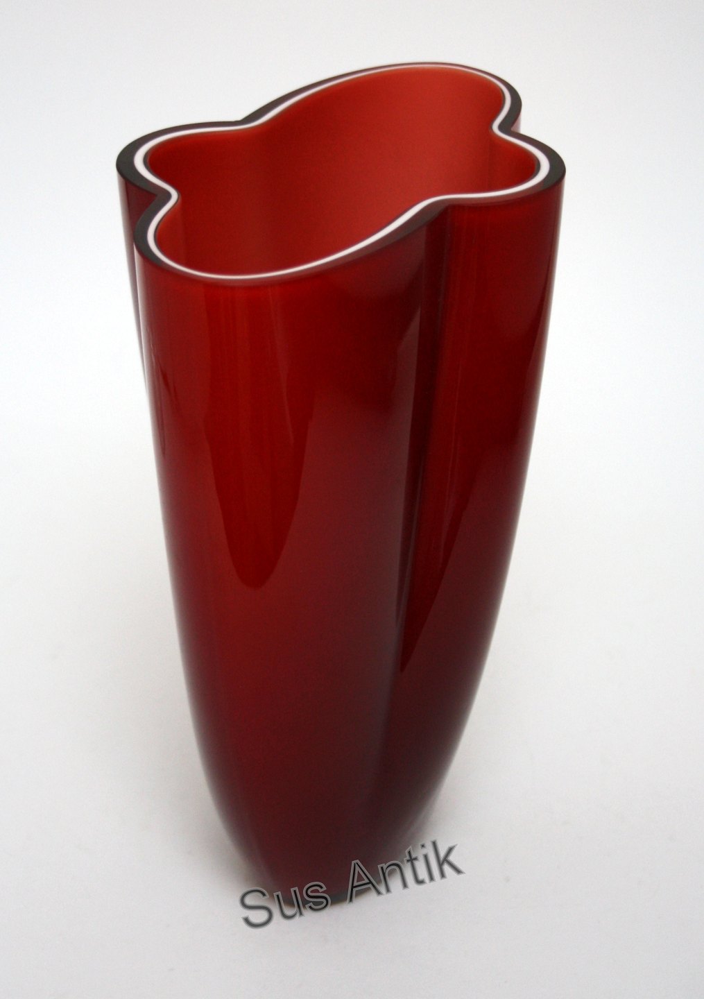 Holmegaard, Gardenia rubin rød vase med hvid kantstribe og støvet rosa indvendig. Designet af Anja Kjær i 1990. Højde 23 cm. Bredde 12,5 cm. Længde 16,5 cm. I sortering. Pris: 425 kr.