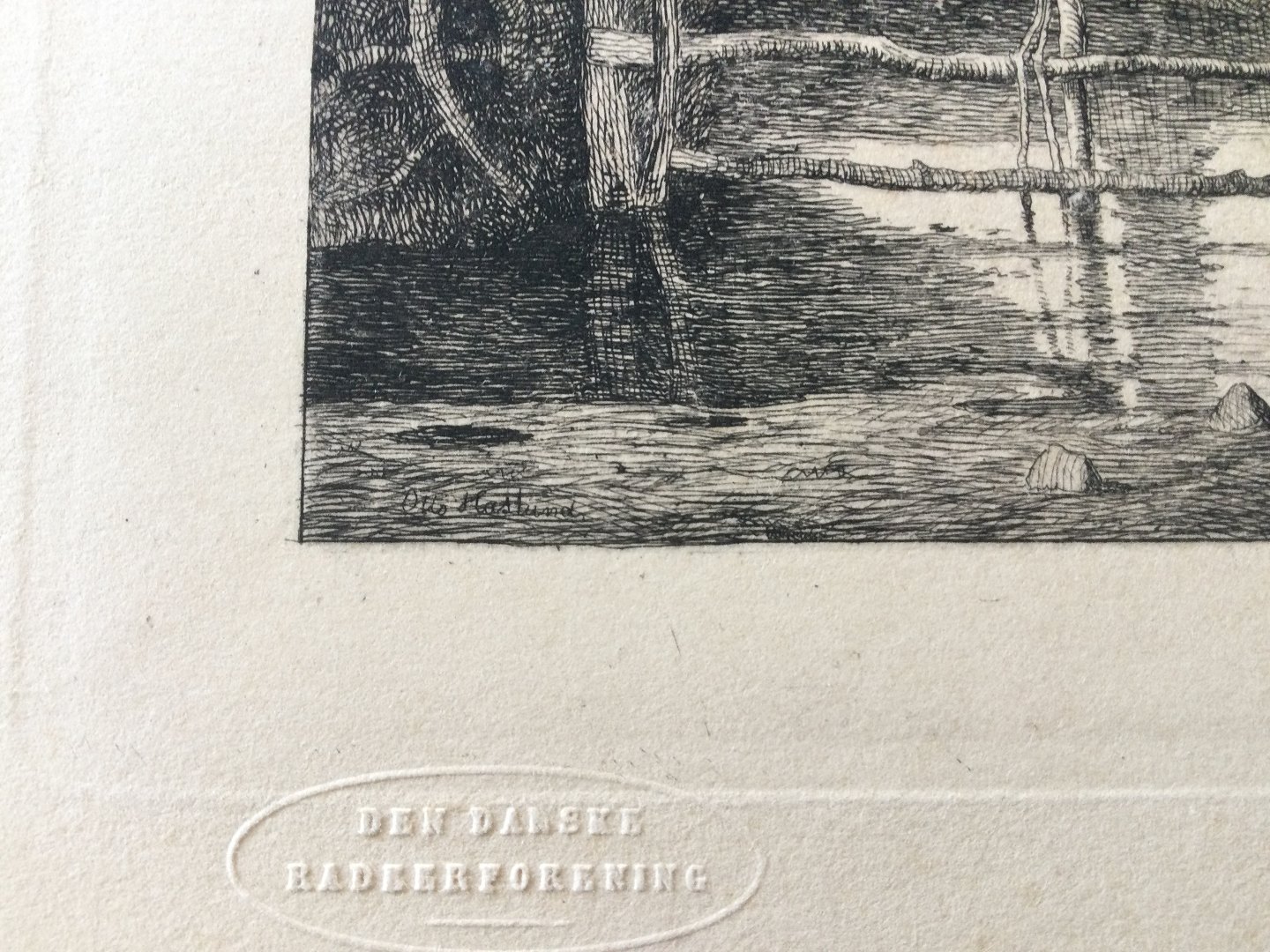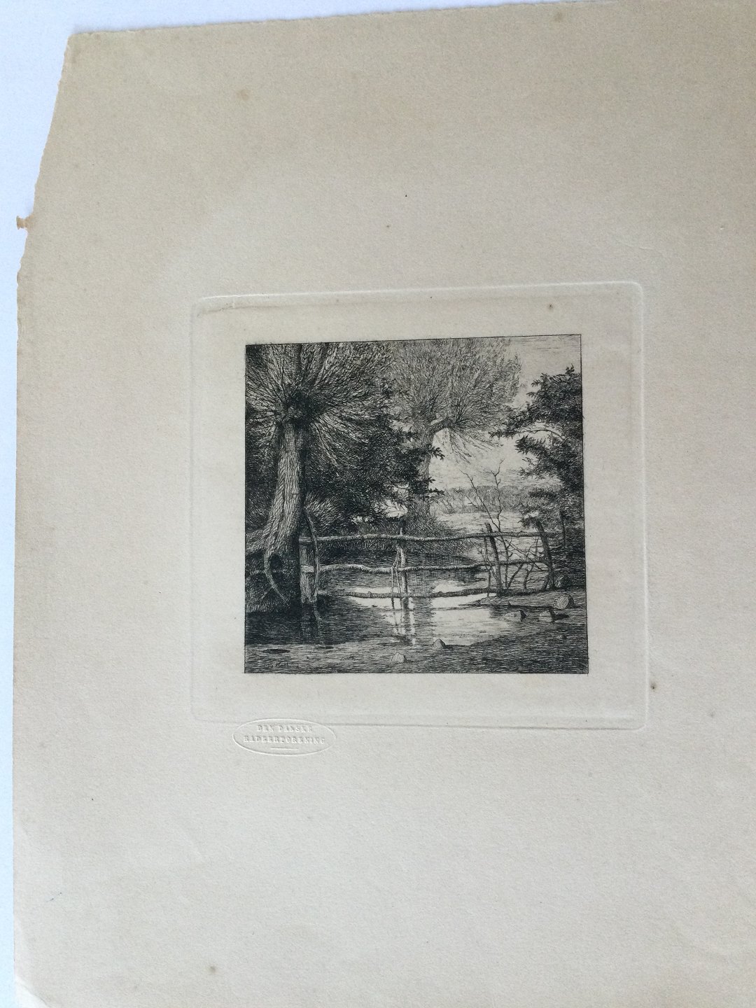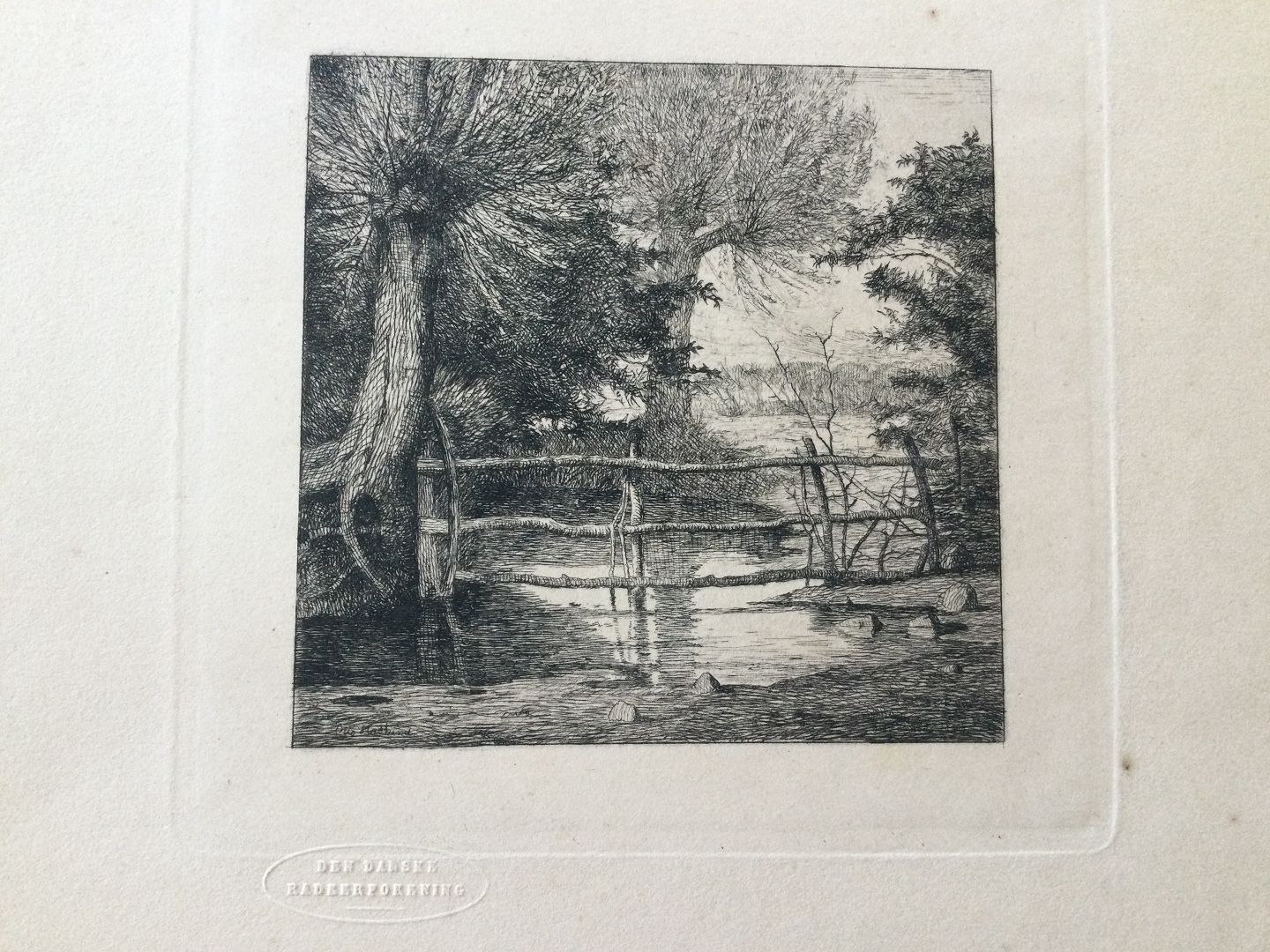 Text available in Danish: Radering fra DDRF af Otto Haslund - Piletræer ved en indsø 1865.