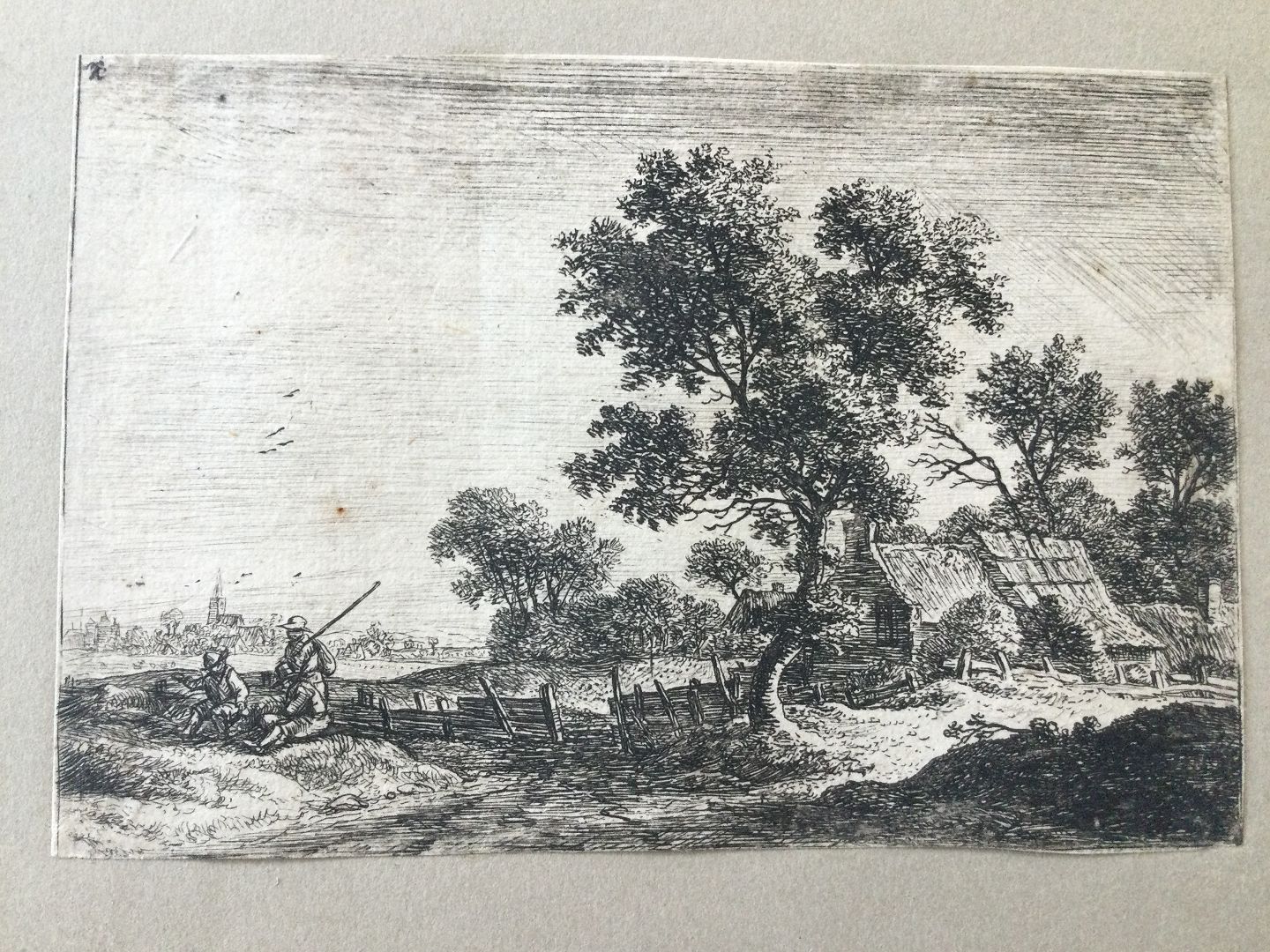 Kobberstik af Anthonie Waterloo - 3 bønder udenfor en landsby.