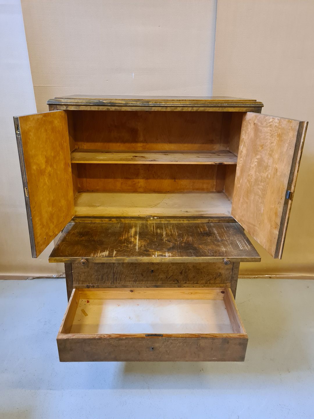 Dækketøjsskab i fineret og bejset birketræ fra 1930erne.